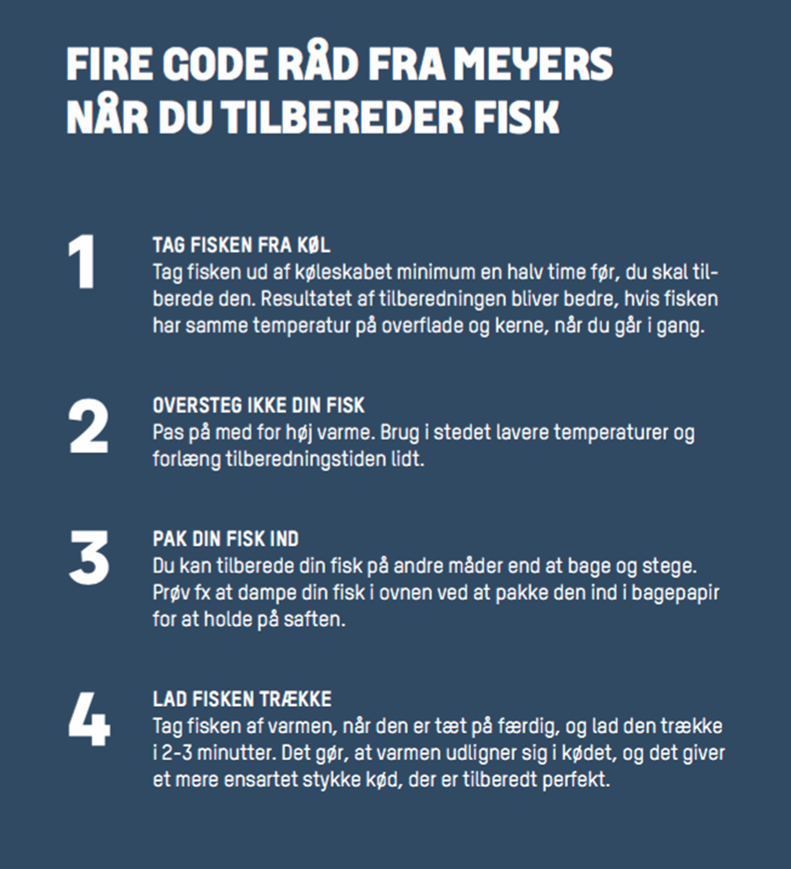 De kølige vande omkring Danmark rummer nogle af verdens bedste spisefisk. Vi vil gerne bidrage til en udvikling, hvor vi øger fokus på vores regionale fiskearter og er med til at fremme de mindre havnes aktivitet og kultur. Vi har i Meyers sat os som mål, at al fersk fisk og skaldyr, vi bruger, skal være fanget med skånsomme fangstmetoder og ikke fra overfiskede bestande.