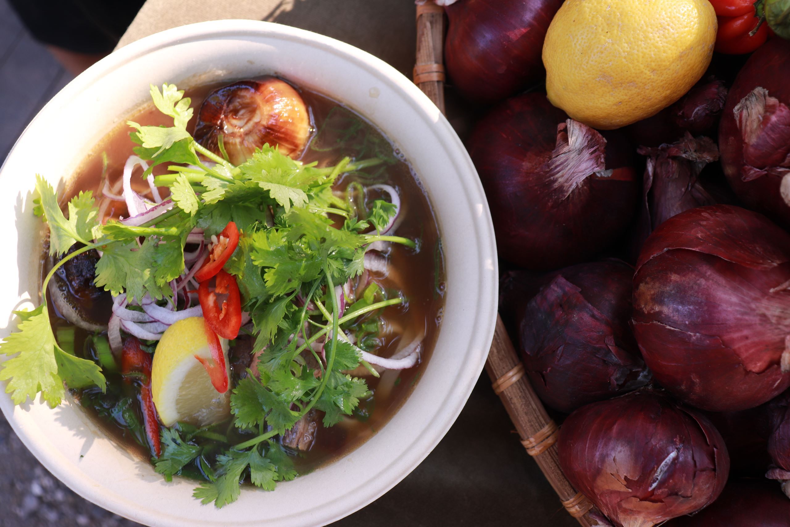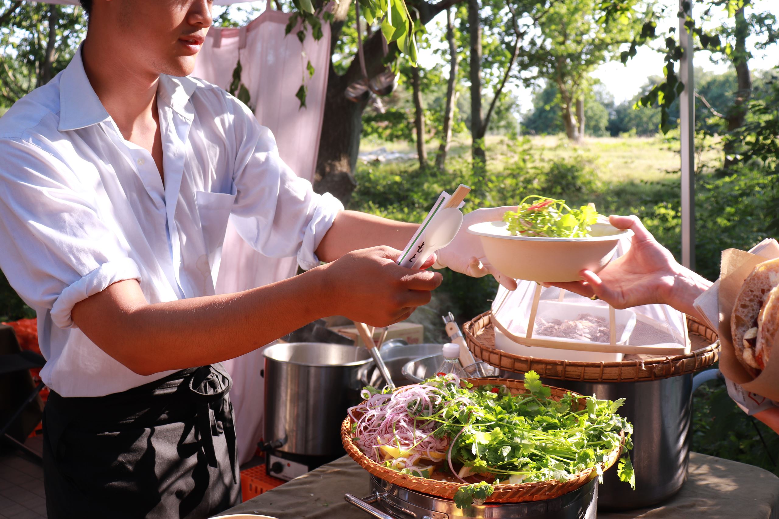 Netop de danske råvarer fyldte i familiens bud på en vietnamesisk sommersuppe til Verdens Bedste Skovtur: Her var lokale overskudsgrøntsager i gryden, ligesom de traditionelle forårsløg blev erstattet af sæsonnære rødløg skåret i papirtynde strimler. Kødet i familien Vo’s phở kom fra projektet Velfærdskød på Møn, hvor ægteparret Karen og Torben græsopdrætter de tyrekalve, der normalt slagtes kort efter fødslen som en del af den industrielle mejeriproduktion.