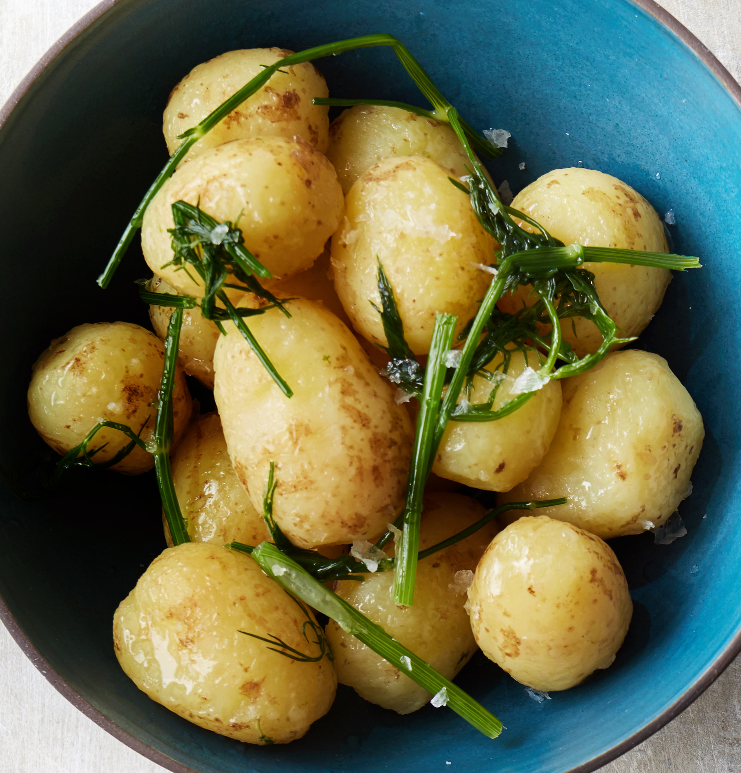 De nye, danske kartofler behøver ikke den store forberedelse - de skal blot skrubbes let og dernæst koges til perfektion, og nydes præcis, som de er. Du kan prøve at tilsætte en stor håndfuld krydderurter til dit kogevand, da det vil give de nye kartofler lidt ekstra smag, og så skal du huske at salte vandet rigeligt, inden du koger kartoflerne. Vandet skal smage af havvand så kartoflerne også får noget af den salte smag.