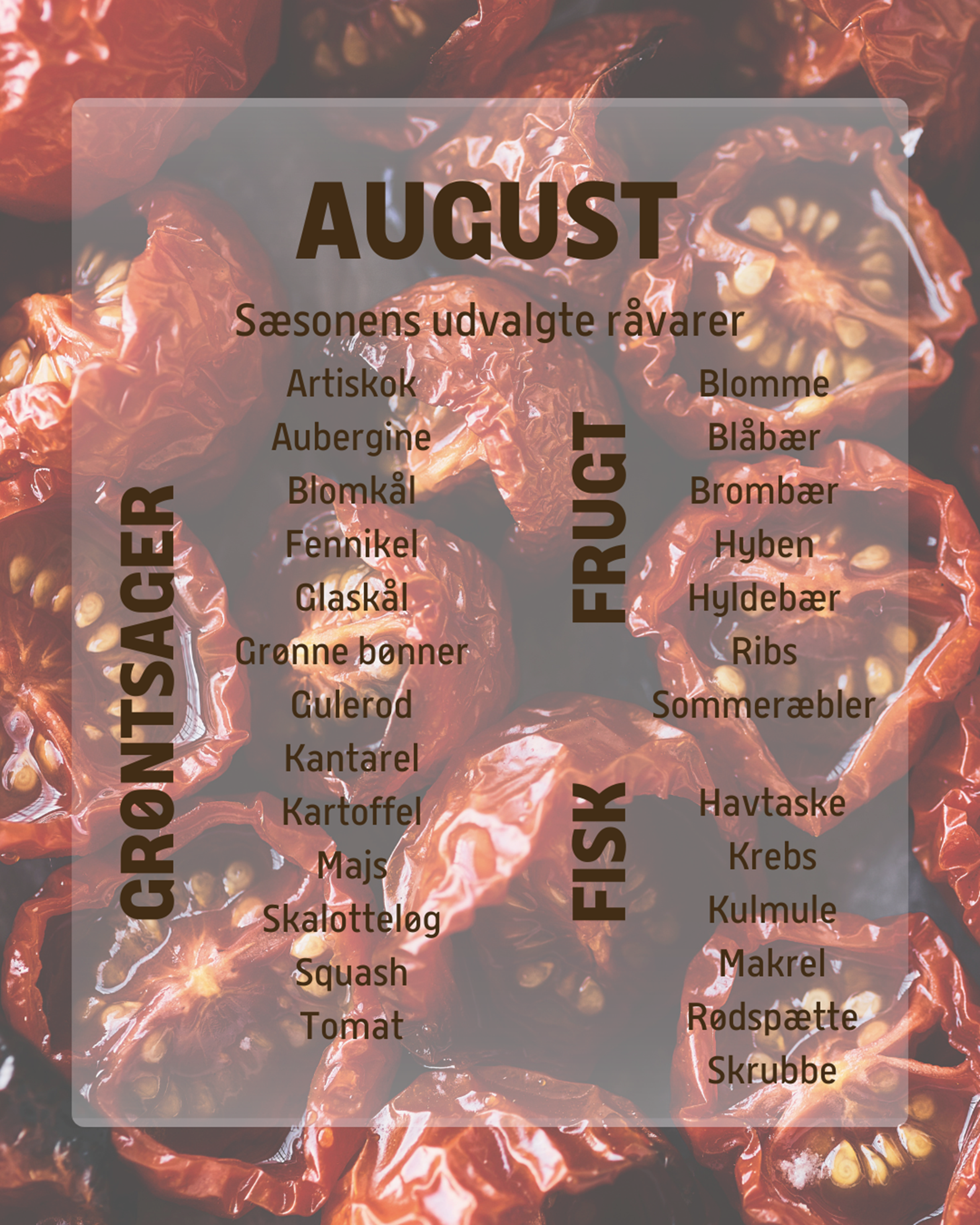 Kalenderen siger august, og sensommeren er en realitet - men sommer er vel nu engang sommer og det gælder om at få det hele med! Selvom dagene så småt bliver kortere og lyset langsomt svinder, er der stadig en overflod af de danske grøntsager, frugter og bær melder for alvor deres ankomst. Tomaterne i drivhuset er blevet modne, kartoflerne har vokset sig til, de faste sommersquash står flot og stikkelsbærrene og de dybmørke brombær er blevet søde af sommerens sol. Så sæt tryk på sensommerstemningen og fyld køkkenet med alt det bedste fra havet, haven og marken lige nu.