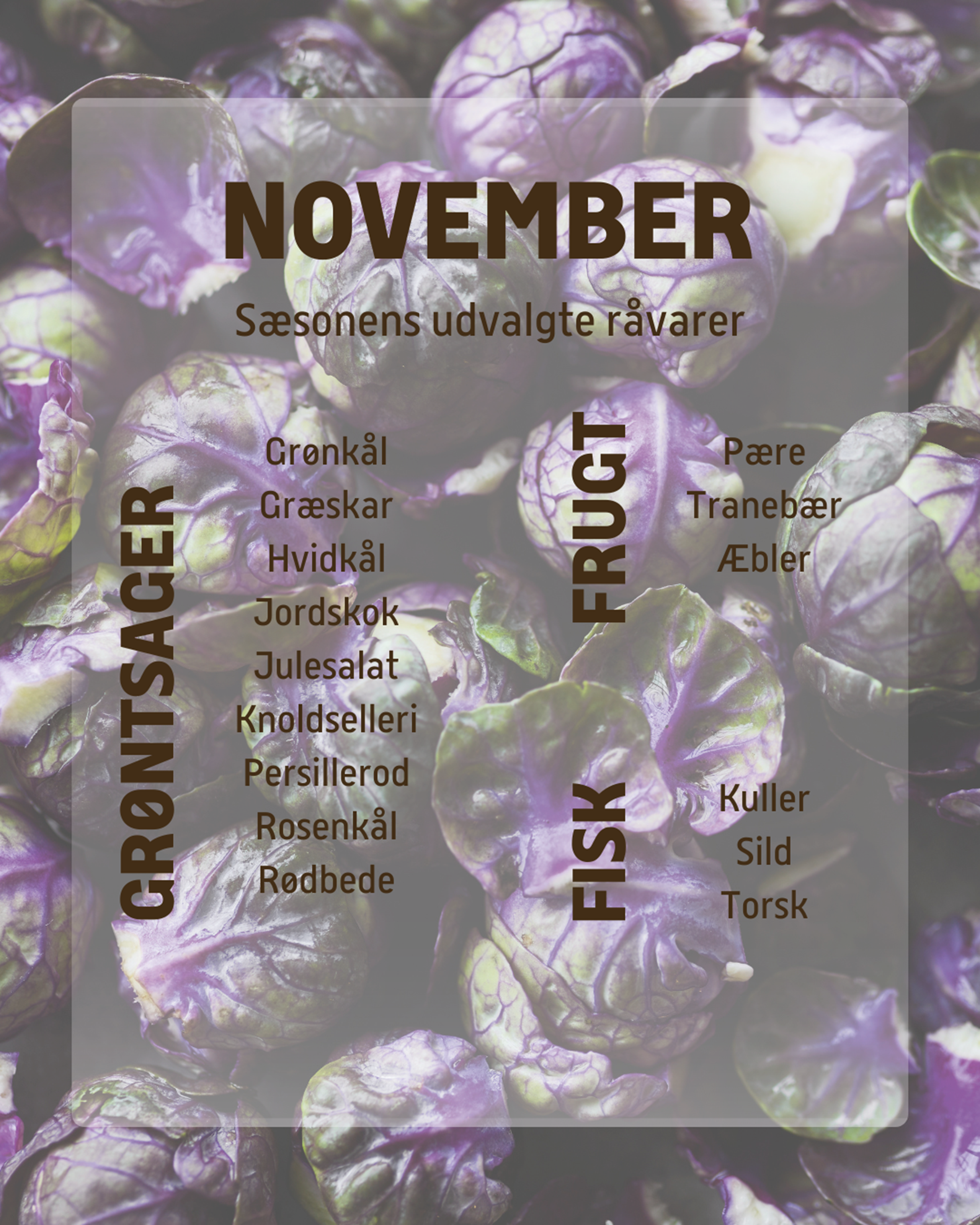 November måneds råvarer har samlet sig en masse saft og kraft i løbet af foråret og sommeren. Denne måned byder på grove grøntsager, knolde, rødder, kål, vildt og friske æbler. Når du vælger sæsonens frugt og grønt, hjælper du ikke kun miljøet, men du får også glæden af endnu mere smag fra de friske råvarer. Dyk ned i novembers råvarer og pynt tallerkenerne med efterårets varme farver og vildtkødets kraftfulde smag.