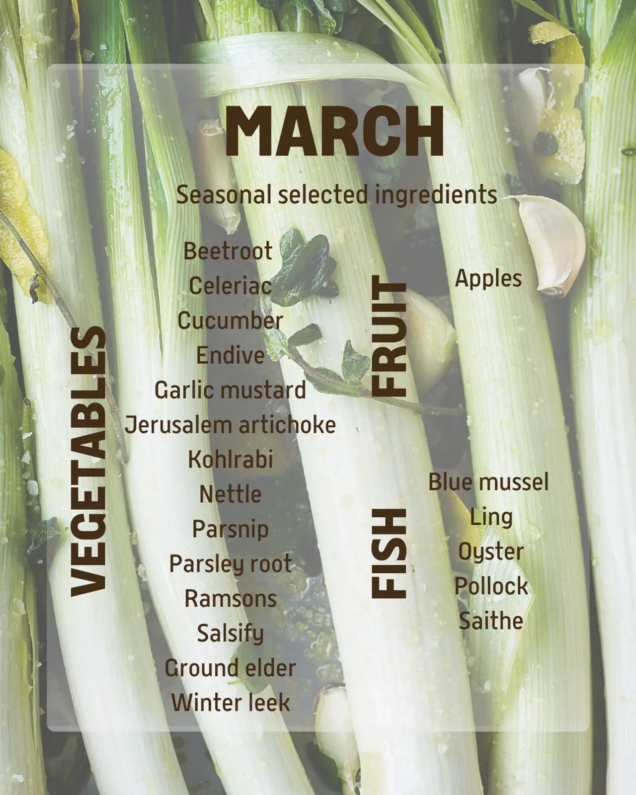 Even though spring is emerging, March is still also the month of root vegetables. Celeriac, beets, Jerusalem artichokes, and parsnips have been stored cool and dark since autumn and have developed even more flavor.