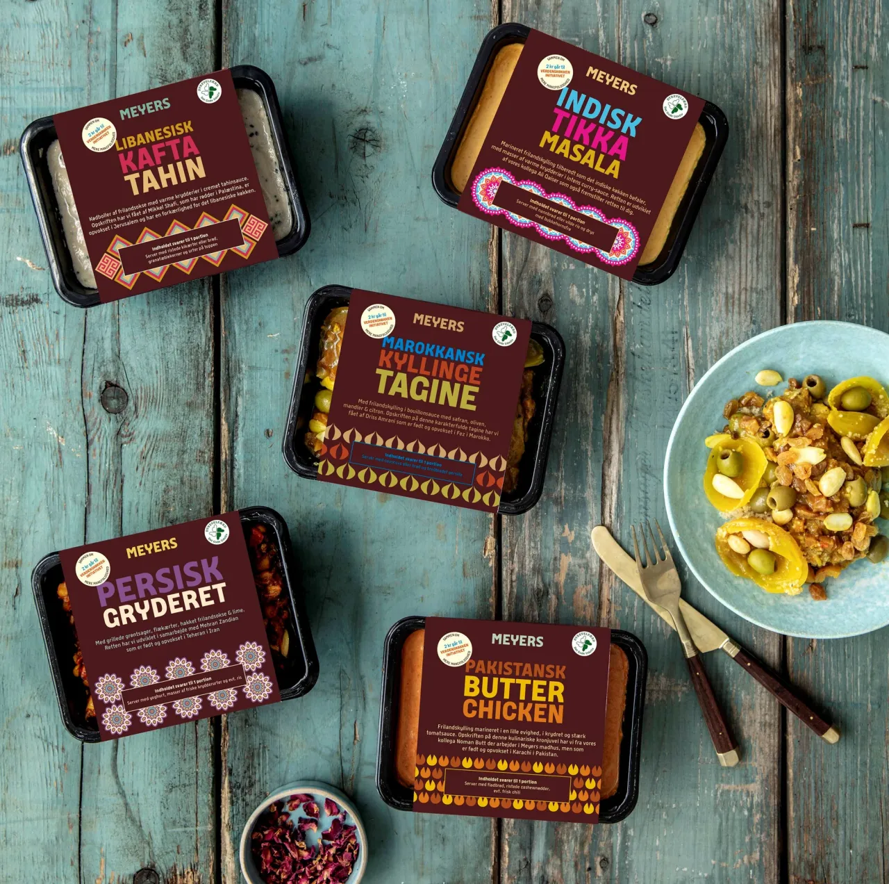Kokkene fra Meyers har sammen med nydanske kollegaer og venner af huset udviklet en række retter, der hver for sig repræsenterer et af verdens mange store køkkener. Serien af retter sælges i Irma, og for hver solgt ret giver Meyers og Irma i fællesskab 2 kr. til Verdenskøkkeninitiativet, som fejrer mangfoldigheden i Danmark ved at støtte projekter, der – med mad som middel - fremmer samtaler og samvær på tværs af kulturer.