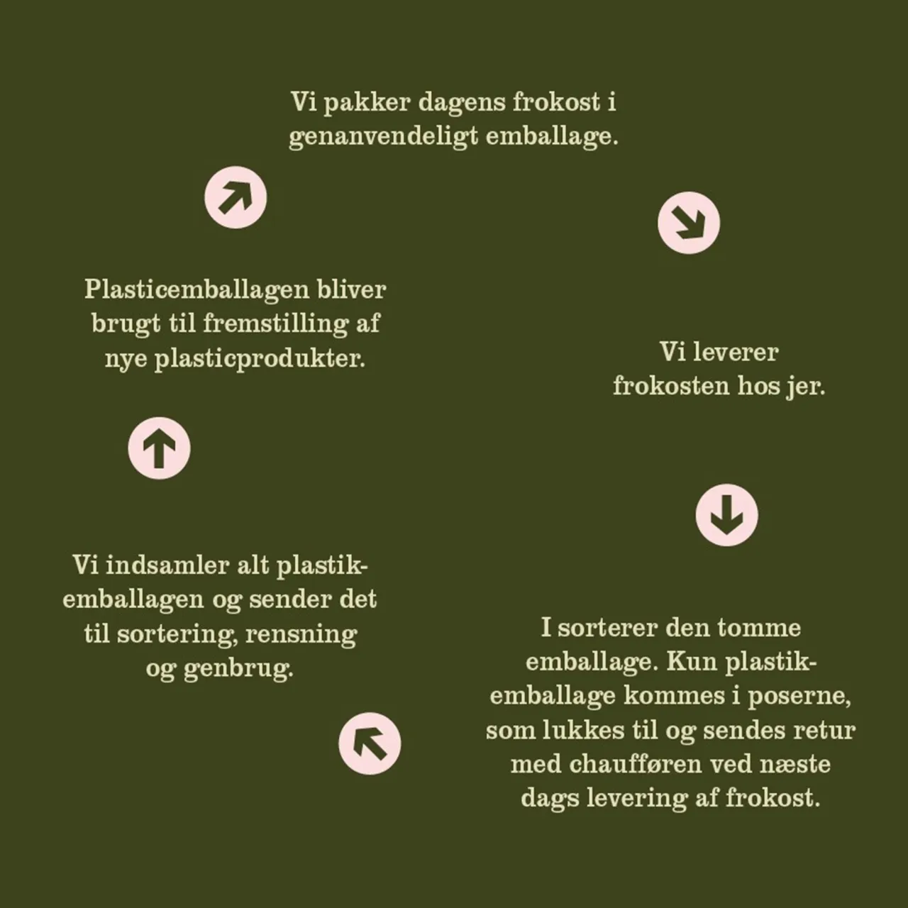 Vi har løbende arbejdet hen mod en mere bæredygtig drift, og vi er derfor meget glade for, at vi nu kan tilbyde vores frokostkunder at tage plastikemballagen fra vores portionspakkede frokost med retur, så plastikmaterialerne kan få nyt liv.