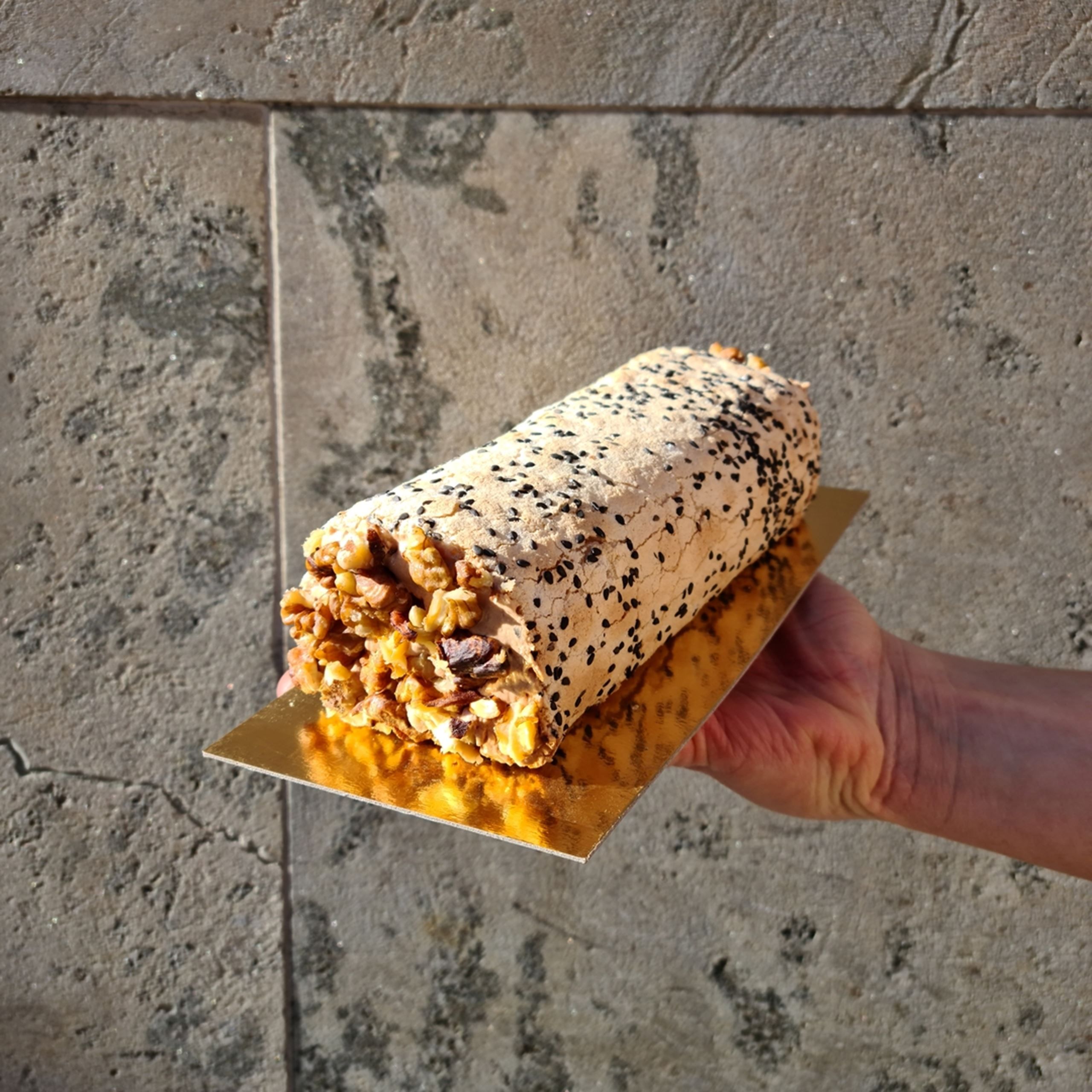 Rouladen er rullet af en sprød fragilité-bund af marcipan og sesam og fyldt med mælkechokoladesmørcreme.