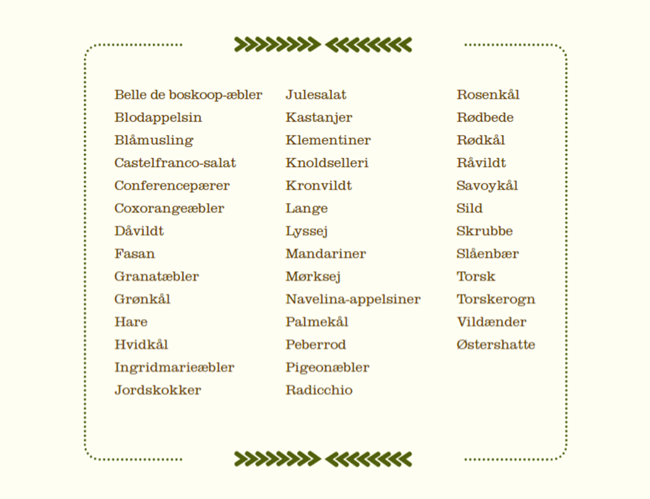 Selvom det er vinter, bugner naturen af lækre råvarer. Herunder har vi udplukket mange af vores favoritter, sådan at du kan danne dig et overblik.