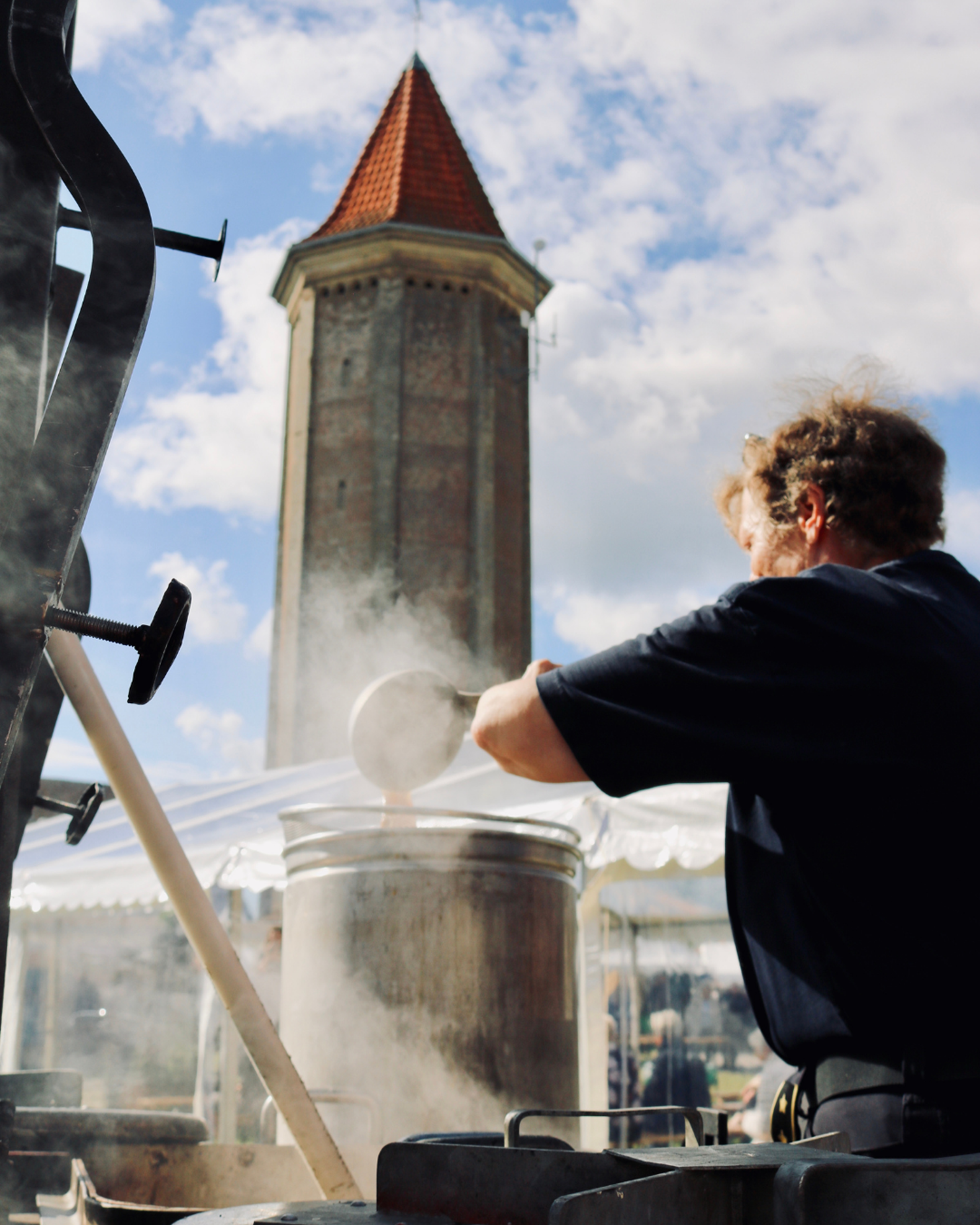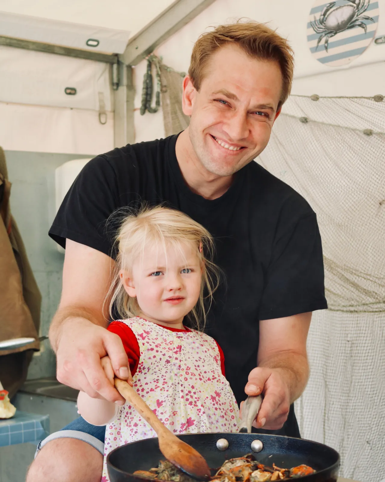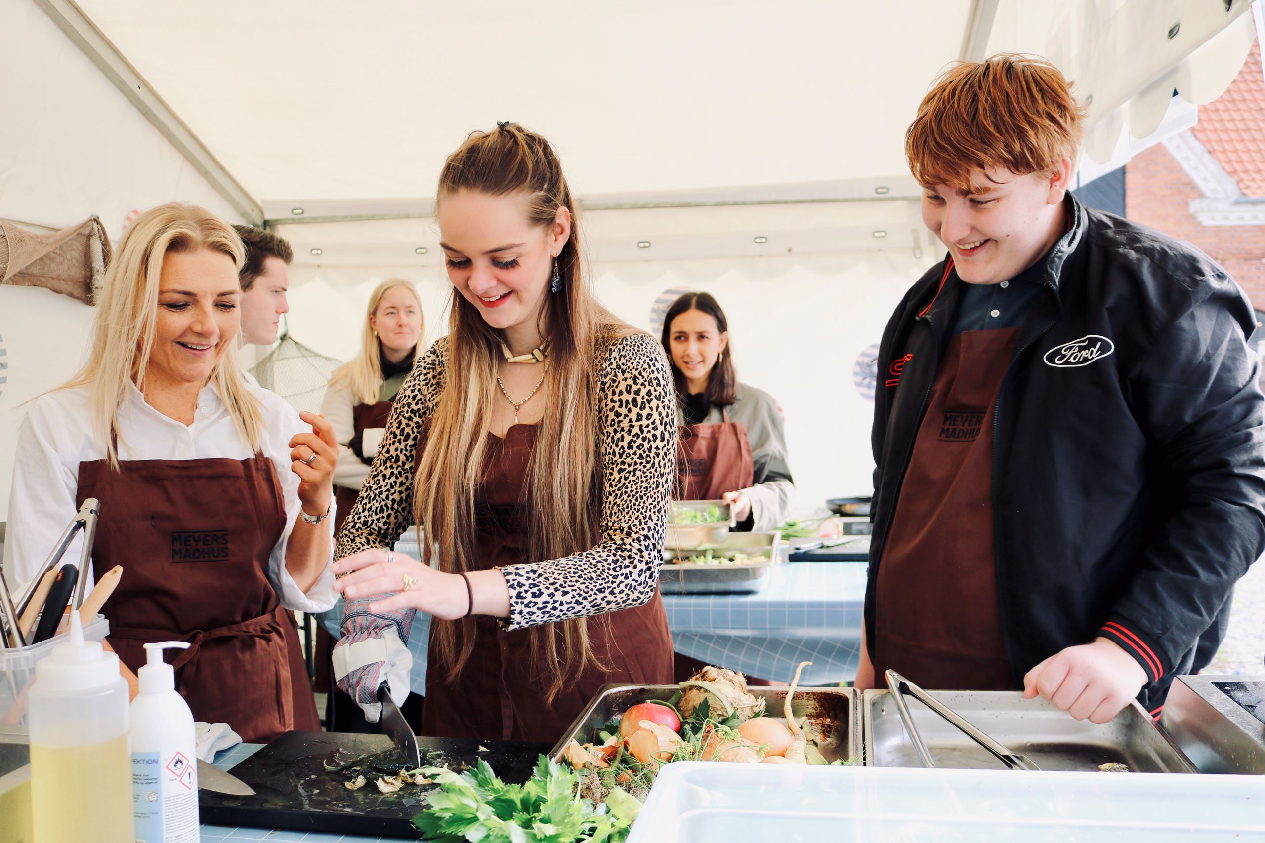 “ I det fjerneste hjørne spredte duften af urter og skaldyr sig fra Meyers teltet, hvor det store feltkomfur, der rummede en overordentlig stor mængde strandkrabbebisque, blev sat over blus med hjælp fra Lolland-Falster Brandvæsen, mens gæsterne på pladsen hjalp med at hakke og snitte og de gode folk fra Foreningen for Skånsomt kystfiskeri fortalte om bæredygtige fangstmetoder.