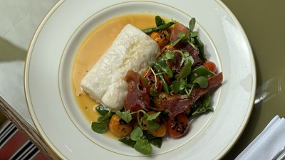 Pocheret torsk i en fyldig skaldyrs blanquette mættet med jomfruhummerkød, ørredrogn, selleri, æble og friske urter |