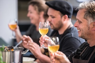 Efter samarbejdet i køkkenet, nyder i sammen en udsøgt middag med nogle af sæsonens bedste økologiske råvarer, med en særligt afstemt vinmenu eller øl, most og kombucha til.
