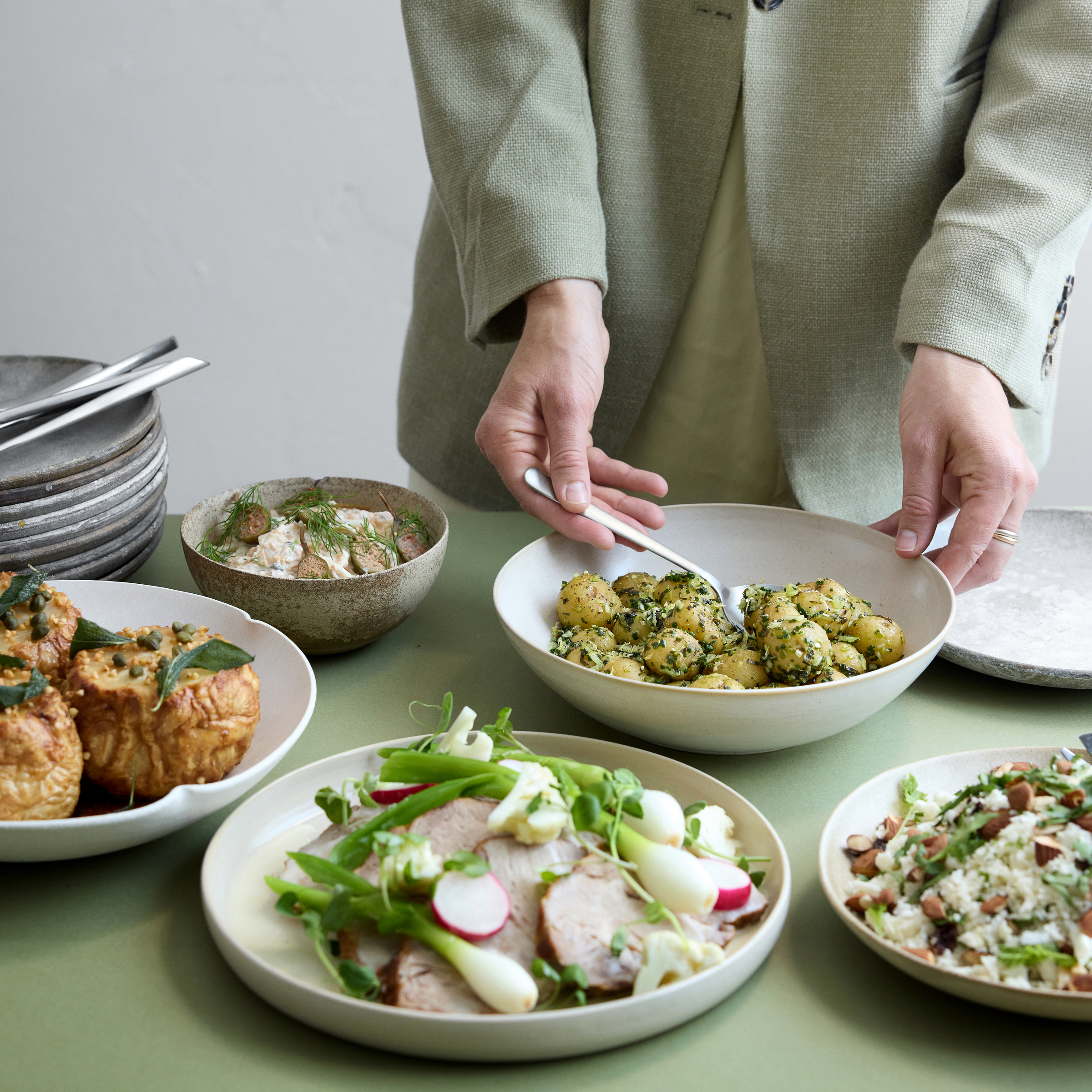 Den varme ret komplimenteres af spændende og fyldige salater og grønt tilbehør