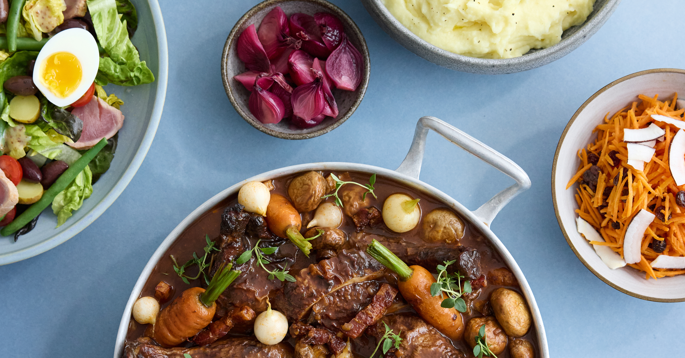 En varm ret med kød og årstidens grøntsager. Retten kan også serveres i en vegetarisk, vegansk eller laktosefri udgave