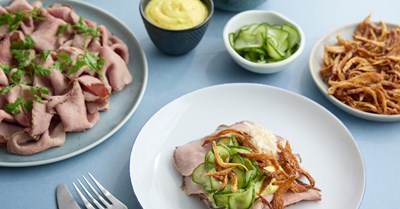 Oksebryst med pickles, revet peberrod og agurkesalat.