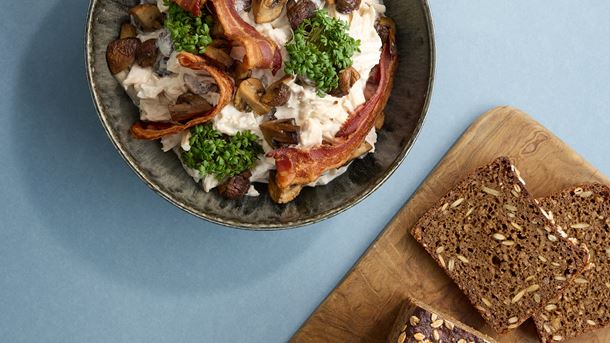 Hønsesalat med asparges, svampe og bacon (1, 3, 7)