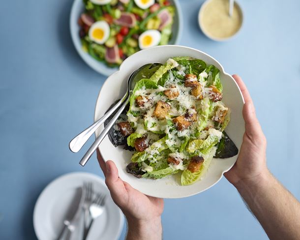 Plukket kyllingebryst med cherrytomater, Grana Padano og cæsardressing (7, 3).