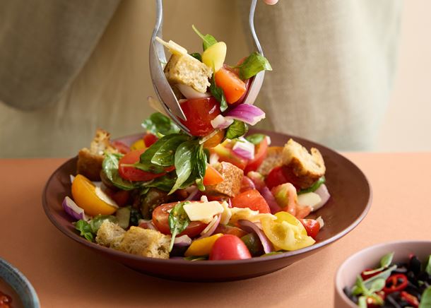 Panzanella med Meyers hvedebrød, tomater, rødløg, agurker, basilikum og feta. Toppet med balsamicoglaze (1, 7).