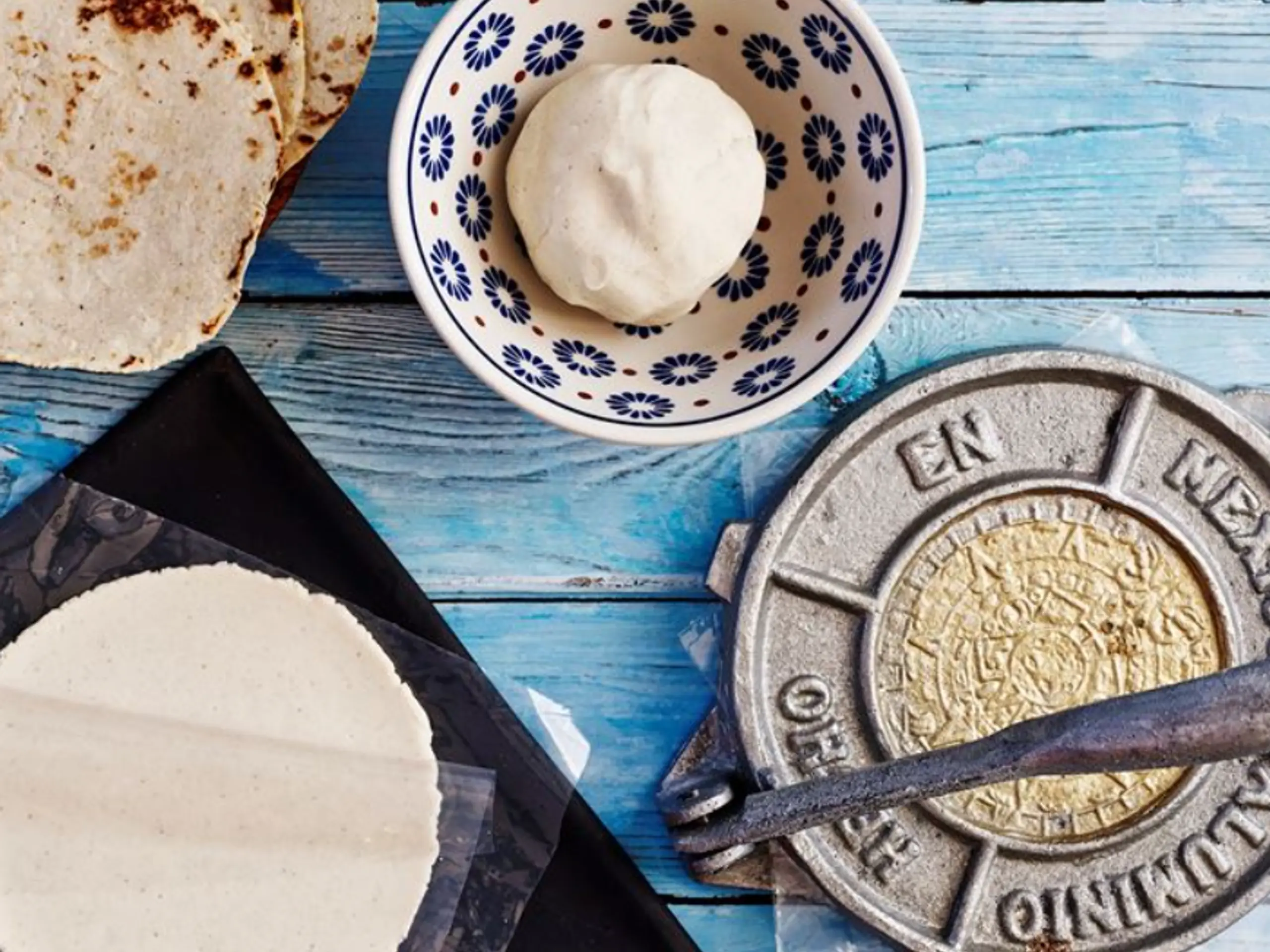 Du lærer at lave bløde majstortillas med det særlige fint malede og ’nixtamaliserede’ majsmel ’masa harina’, som vi presser helt flade ved hjælp af tortillapressere af støbejern.