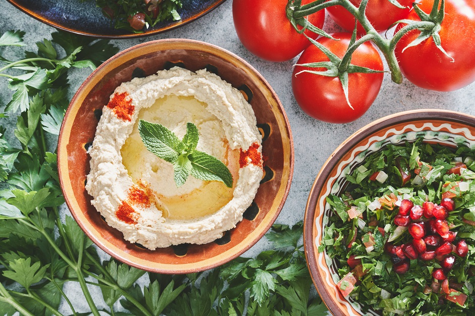 Vi skal lave toumiyeh, den særlige disciplin at lave ekstremt velsmagende hvidløgscreme og hummus, så den opnår den karakteristiske krydring og tekstur som i Mellemøsten - og selvfølgelig den i Libanon allestedsnærværende tabouleh.