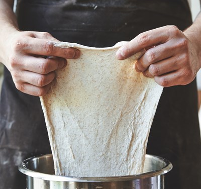 Du kan dog nemt rende ind i et par udfordringer, når du arbejder med deje med et relativt højt indhold af fuldkornsmel. Dels har fuldkornsmel et lavere glutenindhold end sigtet mel, og dels skærer de grove kim og skaldele glutennetværket i stykker. Derfor skal du gøre dig mere umage med æltning for at få en dej, der hæver ordentligt op.
