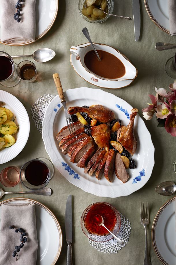 - Andebryst, jordskokkepure, løg & Bourgogne jus og Pommes Anna