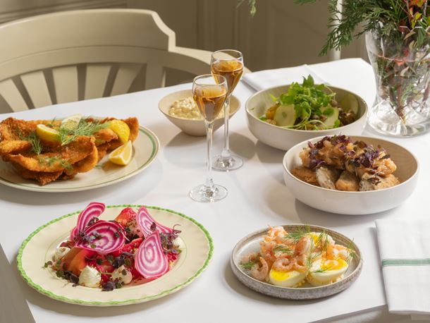 Julefrokosten byder på en række klassiske danske retter: Fra æg, håndpillede rejer og citronmayonnaise til friteret torsk med fennikelremoulade, gammeldags modnede karrysild, gravet laks med peberrodscreme, og risalamande til dessert.