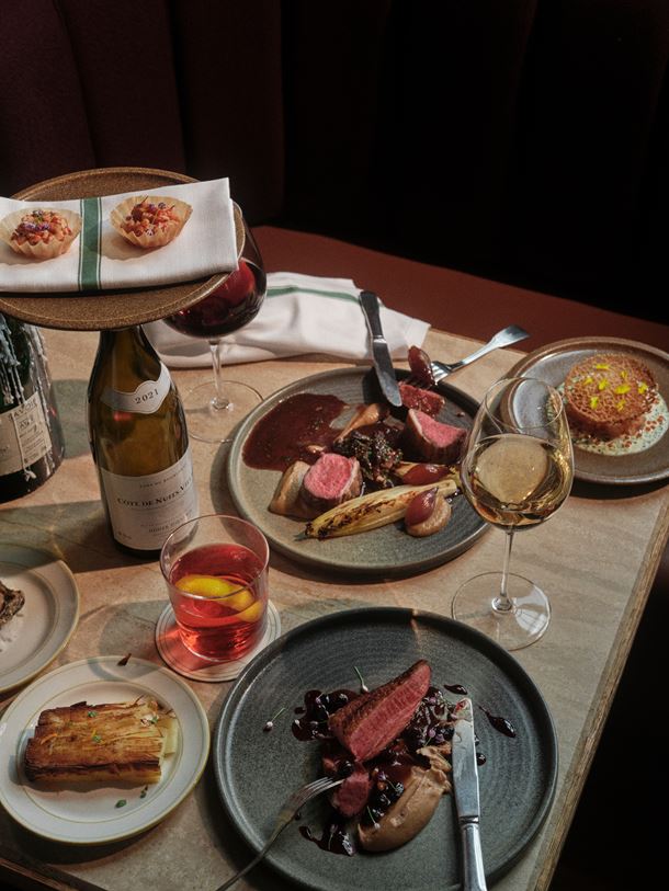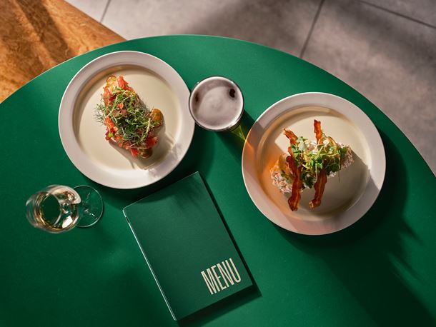 Glæd jer til tre serveringer fyldt med danske klassikere som friteret rødspætte, julemedister, confiteret andelår, sild og meget mere. Som kronen på værket afsluttes frokosten med den franske klassiker clafoutis med kirsebær og mandler.