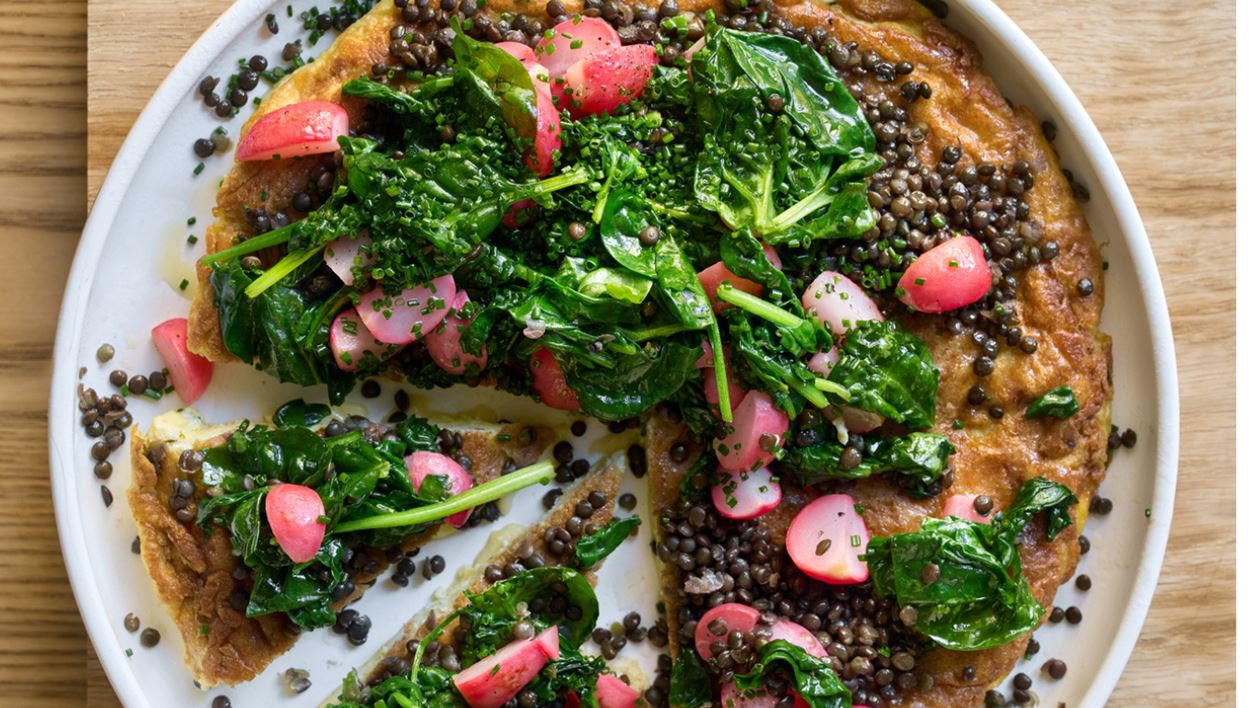Vend æggekagen ud på et fad – eller lad den blive i panden – og top med linser, spinat og radiser.