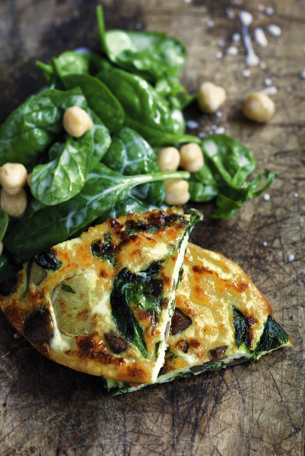 Pil løget og snit det fint. Rens champignonerne. Steg løg og champignon i smør på en pande, krydr med salt og peber. Tilsæt spinat og kartofler, og vend rundt med løg og champignon. Pisk æg og mælk sammen, kom blandingen på panden.