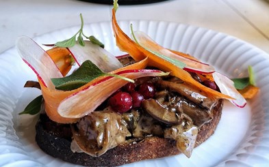 Sprødt ølandsbrød med cremede svampe, tyttebær og frisk oregano