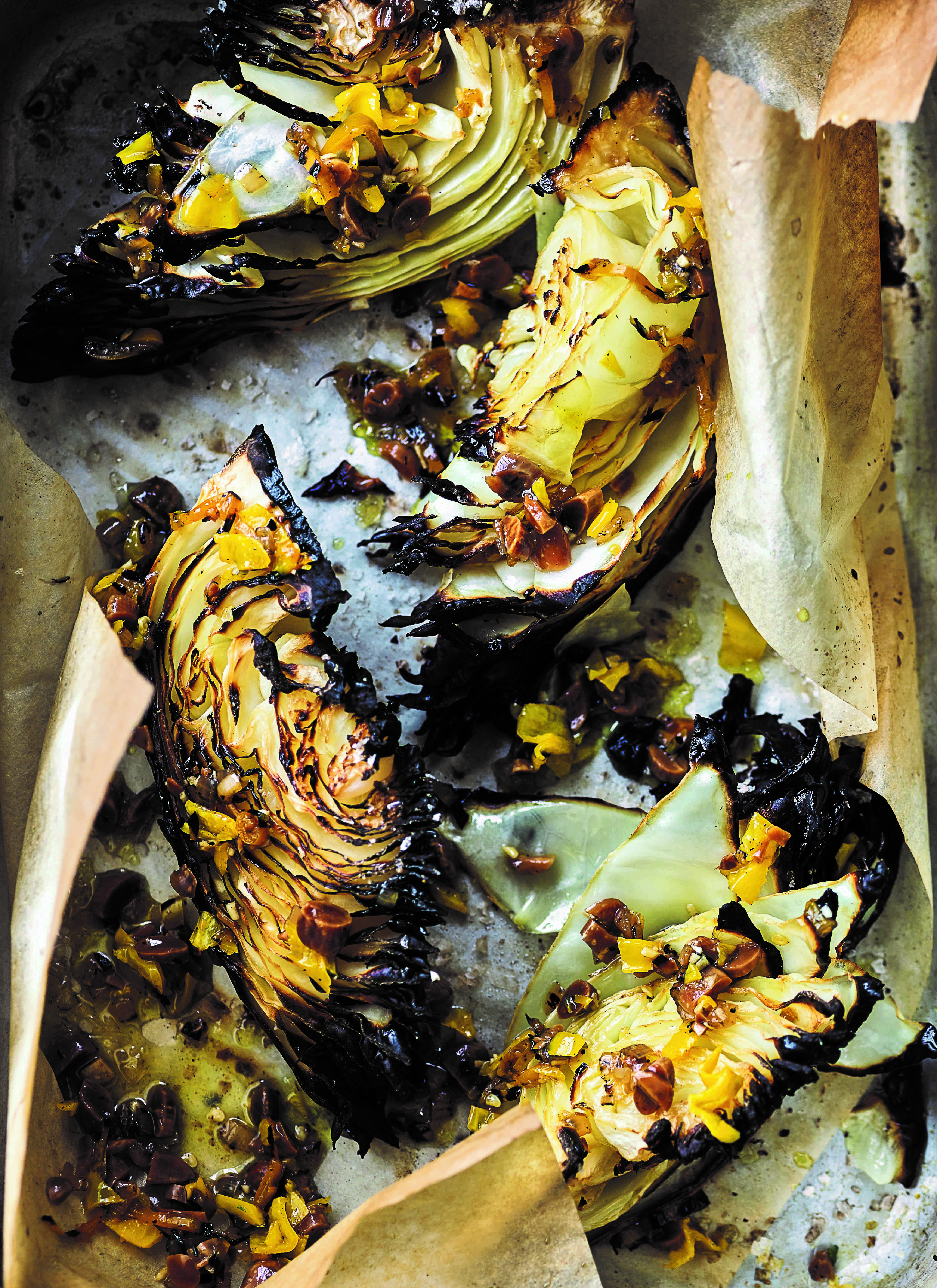 Skær hvidkålen i både på langs. Pensl dem med olie, og krydr alle overflad- erne med salt. Bag dem i ovnen på en smurt bageplade ved 200° i 40-45 minutter, til kålen har en mørk overflade.