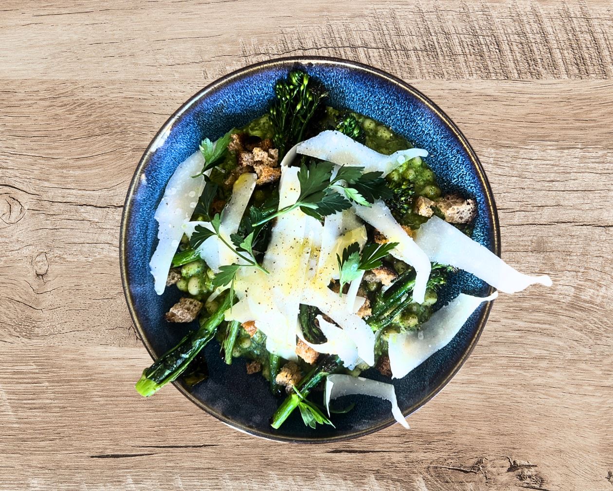 Anret beanottoen i dybe tallerkener, og top med de stegte broccolini, sprøde brødcroutoner, frisk persille og revet ost.