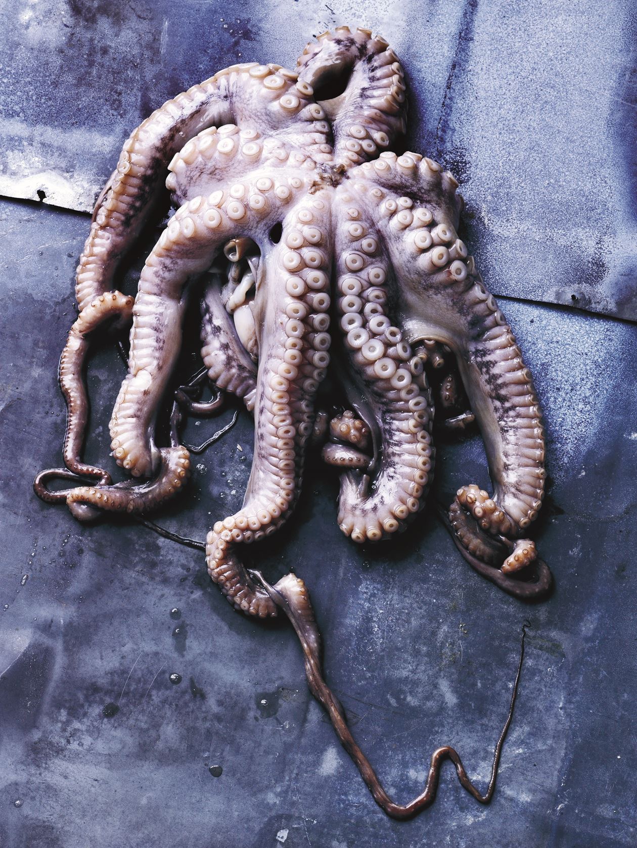 Når løg og peber er ristet af tilsættes den rengjorte blæksprutte og det hele ristes igennem en gang til.