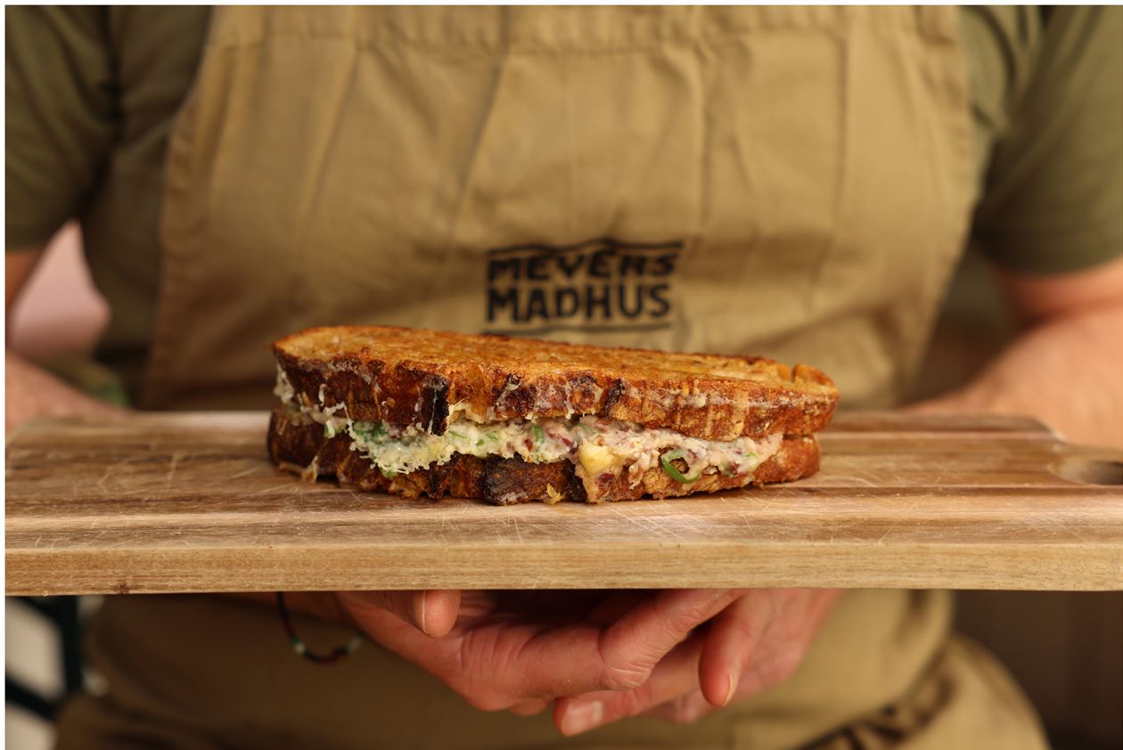 Fordel bønneblandingen på to skiver brød, top med revet ost, og læg de sidste brødskiver over som låg.