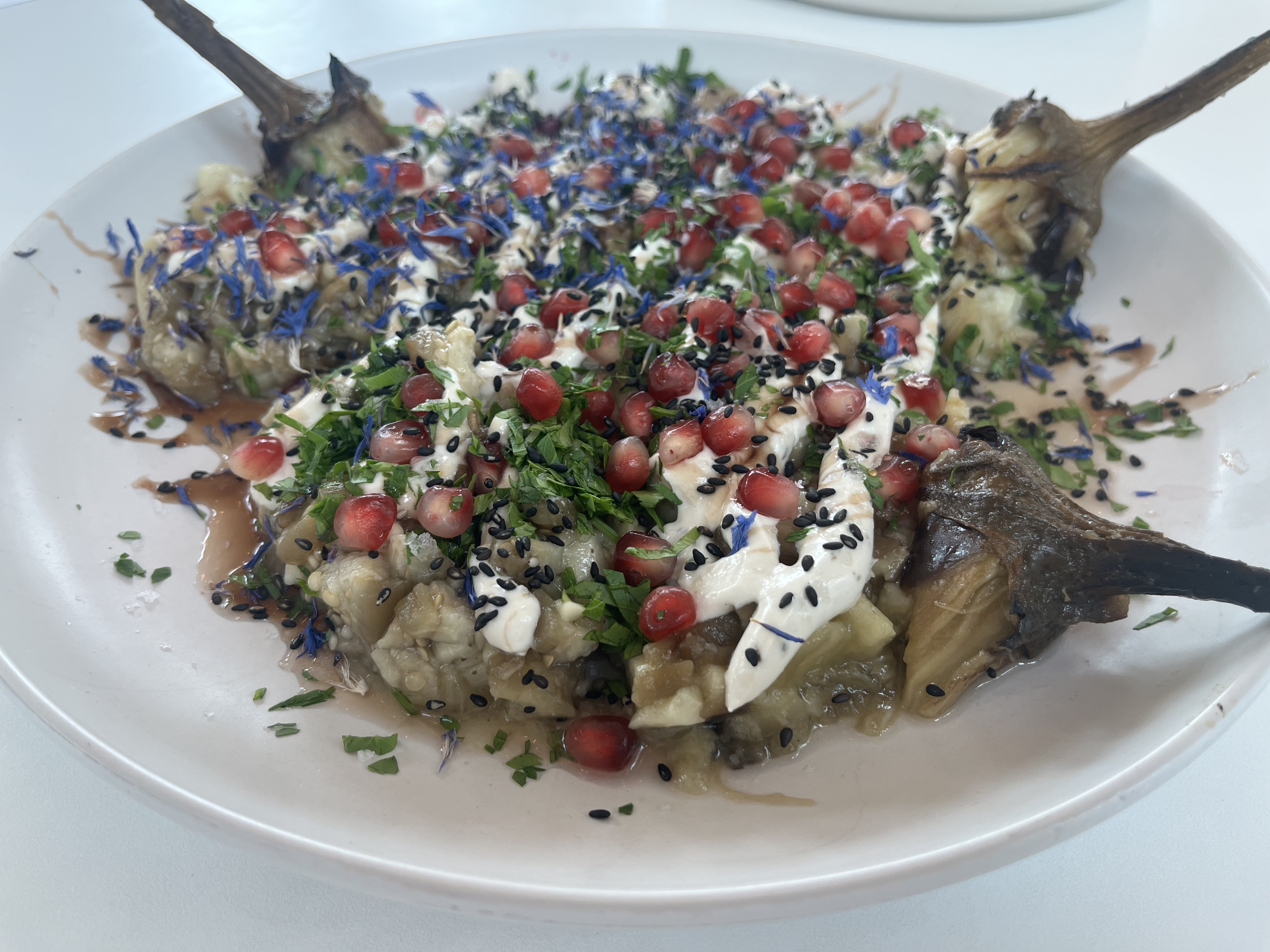 Hæld tahindressingen på toppen, efterfulgt af et dryp granatæblesirup. Drys granatæblekerner, sesamfrø og spiselige blomster på toppen. Afslut med et drys flagesalt.