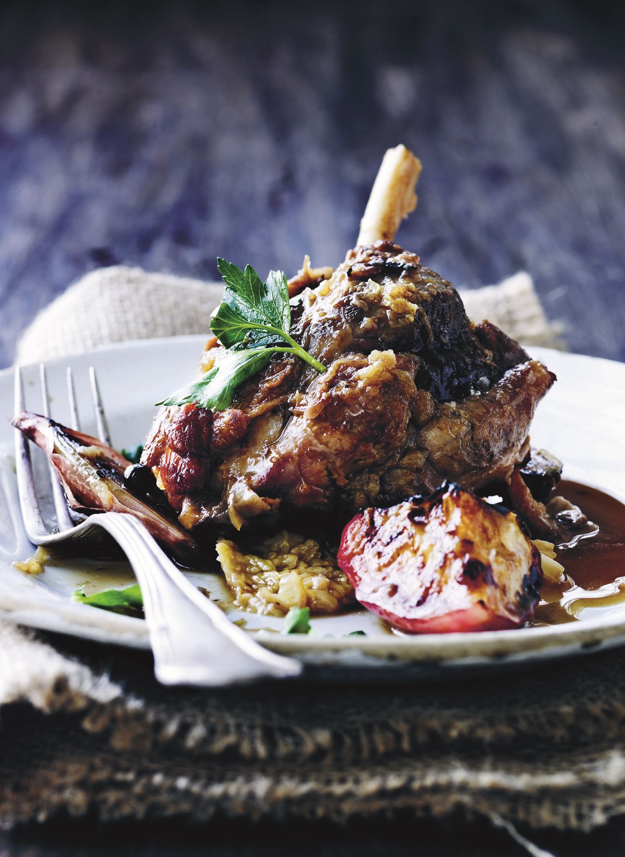 Læg låg på gryden, og sæt gryden i en 150° varm ovn, og lad spolebenene braisere i ca. 1½-2 timer. Vend benene rundt nogle gange under braiseretiden, så de bliver flot glaserede på alle sider. Tag gryden ud af ovnen, og smag skyen til med salt, peber og evt. lidt eddike og sukker. Du behøver ikke at koge den yderligere ind – skyen er fin, som den er; ikke så tyk, men fyldt med kraft.