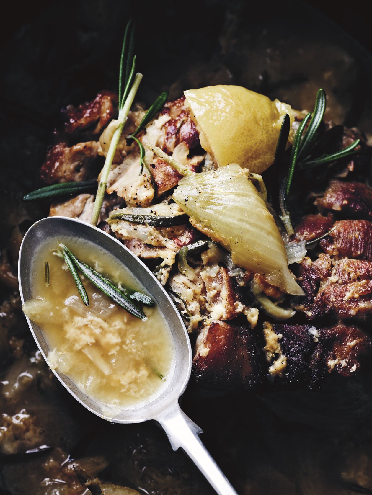 Sving resten af æblerne på en varm pande i maks. 2 minutter med resten af æblegastrikken, og tag dem af varmen. Gem dem til at garnere retten med. Når brysterne er færdige, så tag dem op ad gryden sammen med pancettaen. Sigt braiserskyen fra i en gryde, og kog den ind til den ønskede smag og konsistens. Skær pancettaen i tern, og kom braisergarniture, de bagte selleri og æbler i lidt af skyen og brysterne skåret i tynde skiver. Drys evt med lidt hakket rosmarin.