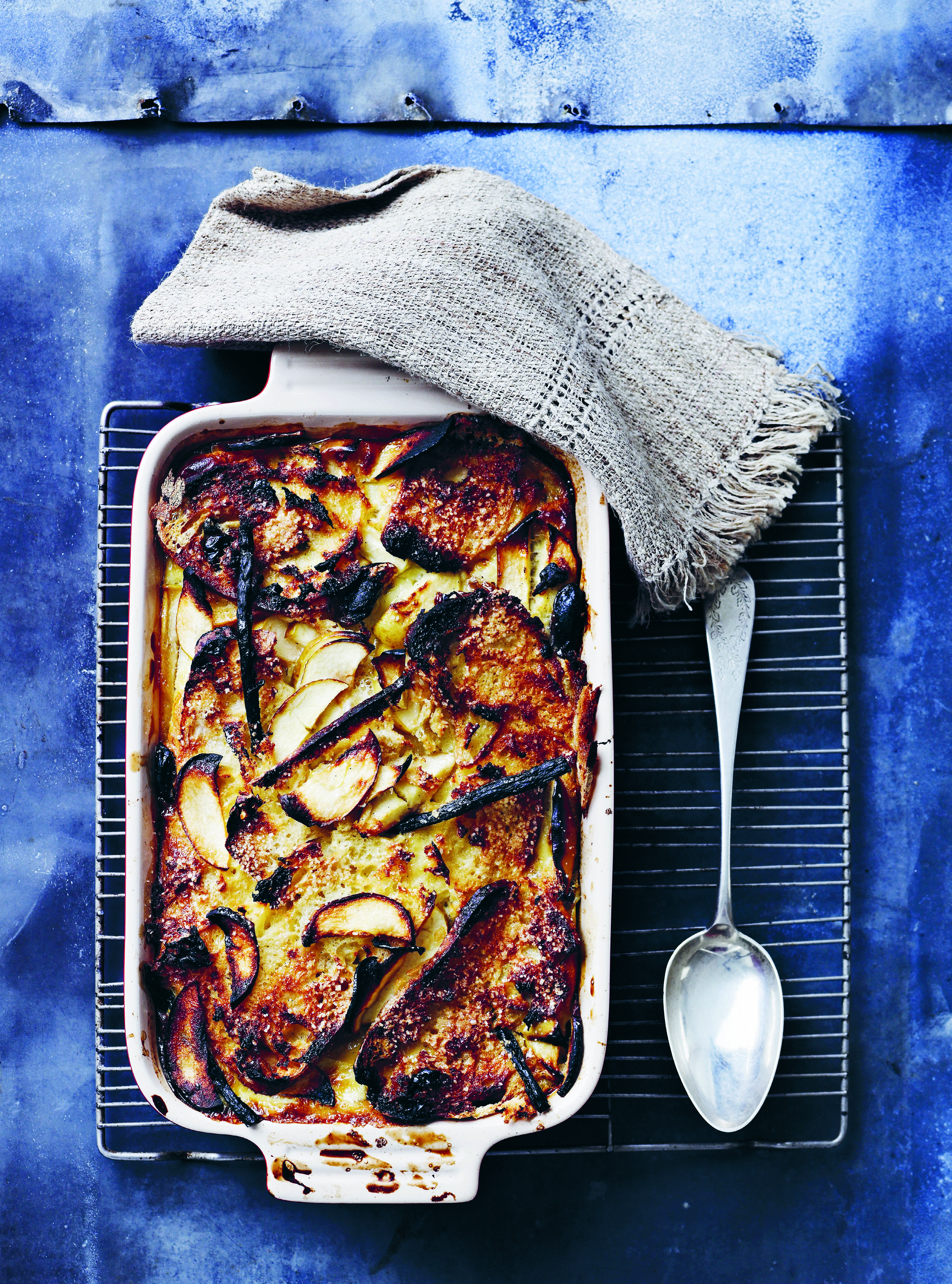 Smør et ovnfast fad med smør, og drys med 2 spsk. sukker. Skær brødet i tynde skiver. Fjern kernehuset på æblerne, og skær også æblerne i tynde skiver, og læg brød og æbler skiftevis i fadet, og drys med lyse rosiner ind imellem. Pisk æg, fløde, mælk og resten af sukkeret sammen, flæk vaniljestangen, og skrab kornene ud, og kom begge dele i æggemassen.