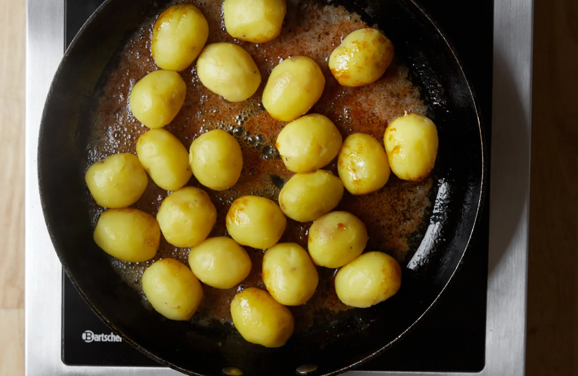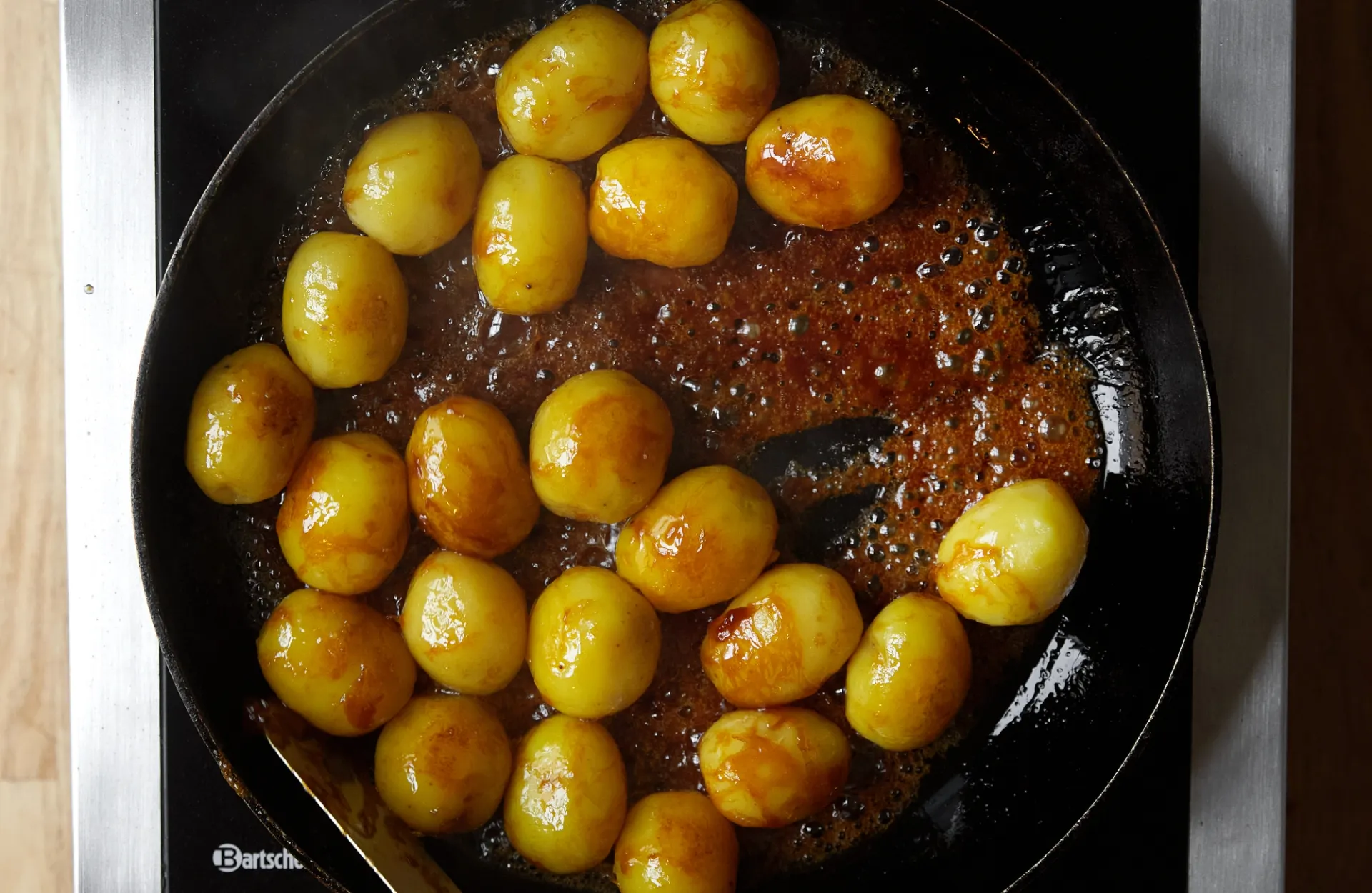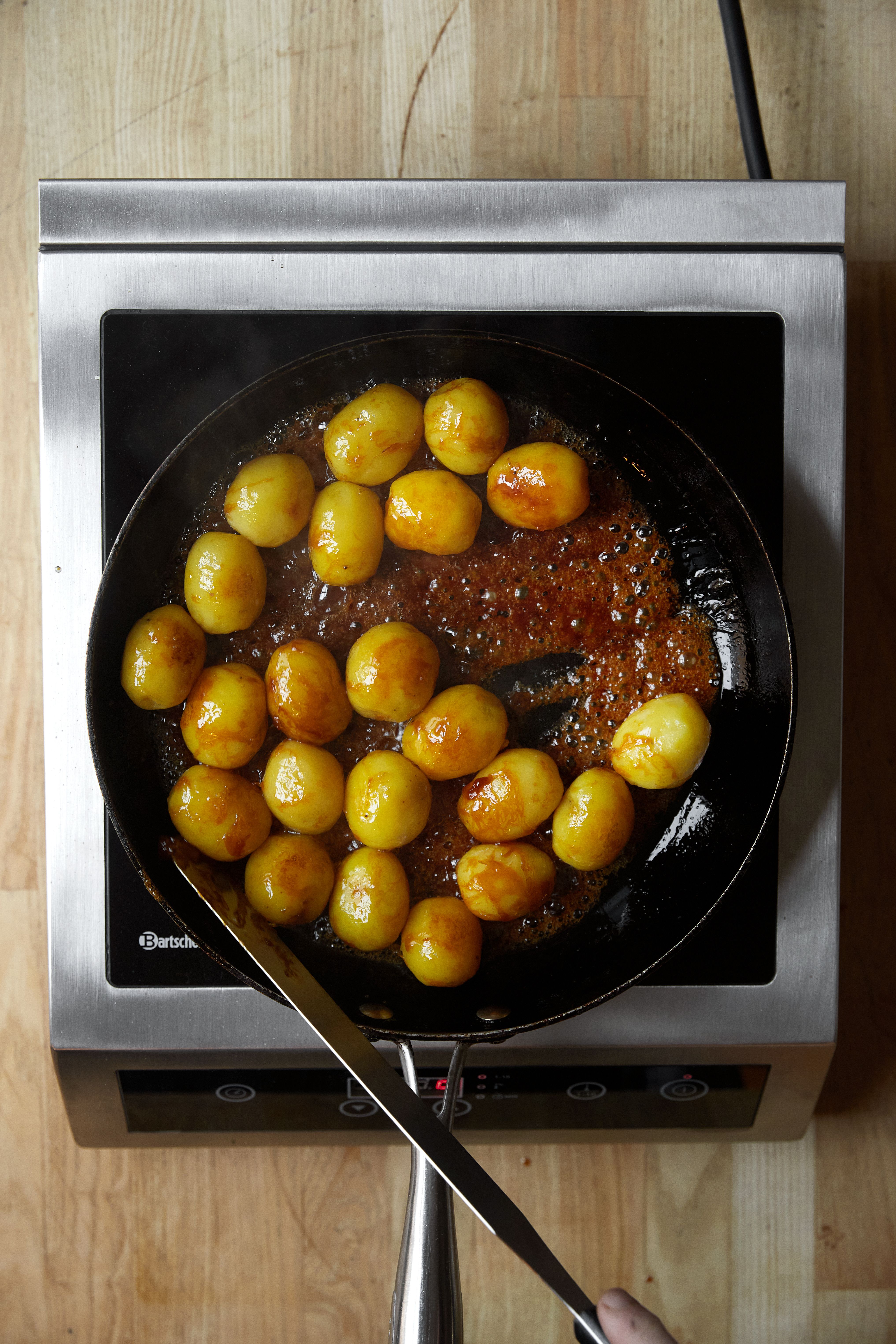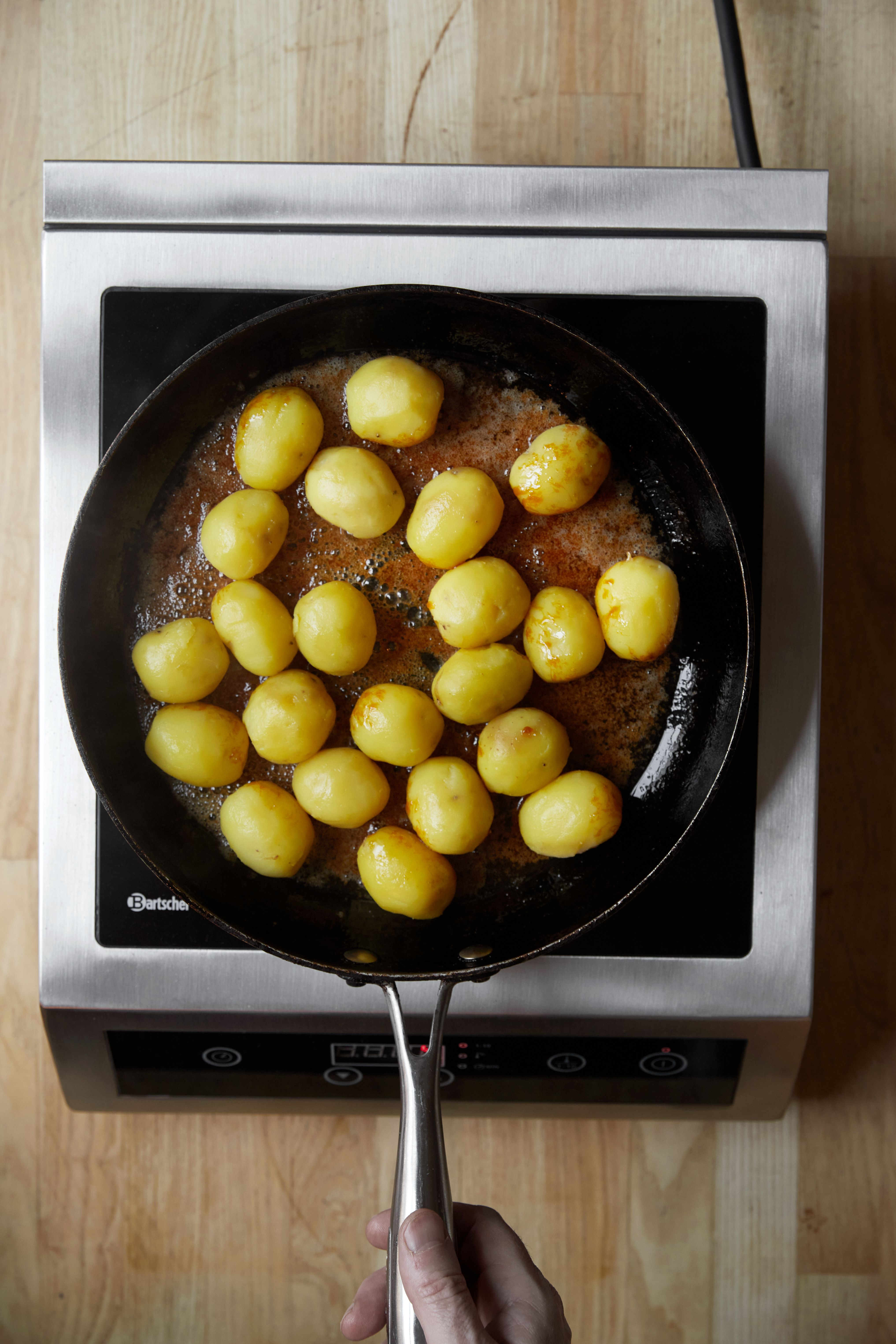 Hæld kartoflerne i karamellen, og lad dem syde et par minutter uden at røre. Ryst panden, så karamellen fordeler sig, og lad kartoflerne glasere i 4–5 minutter.