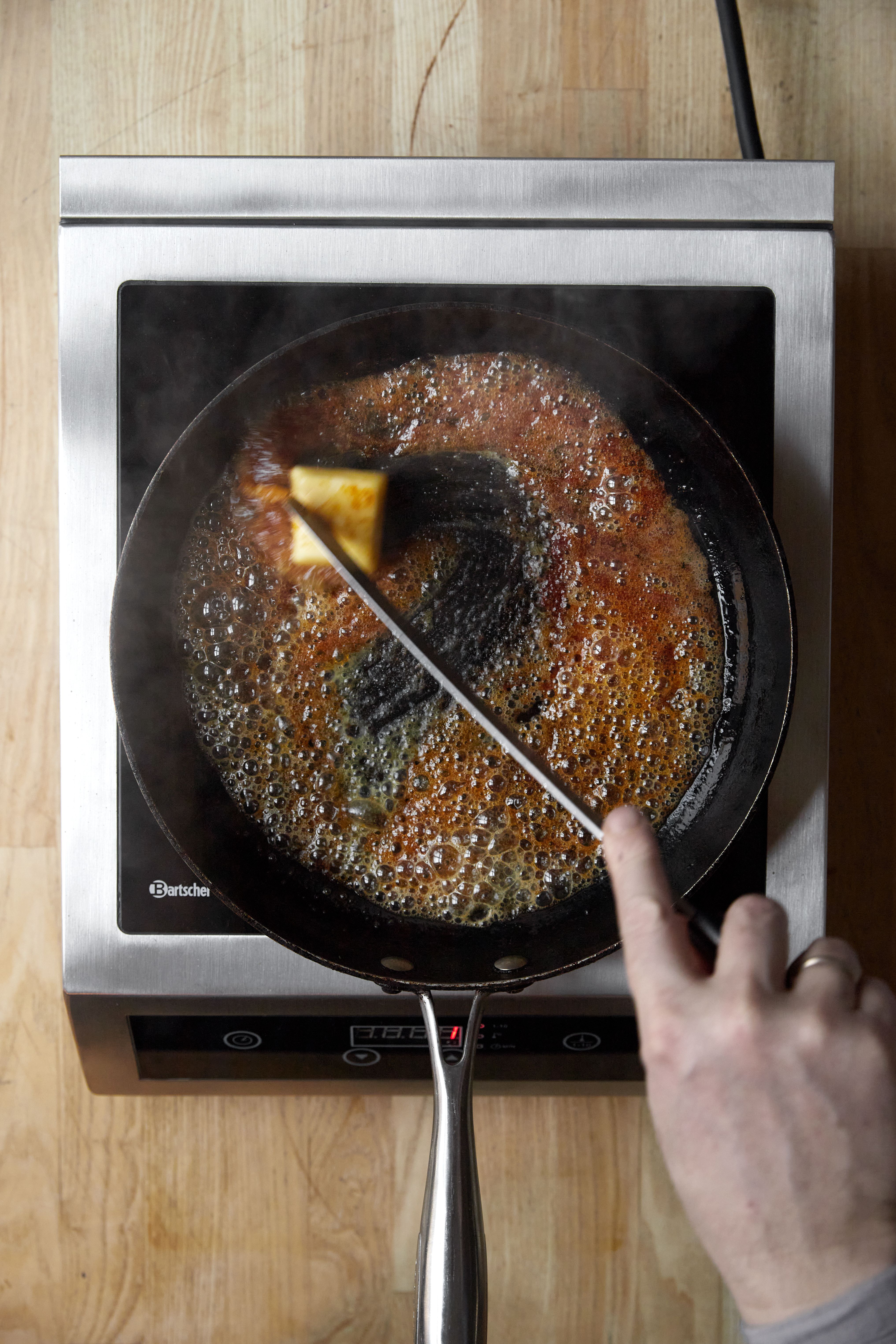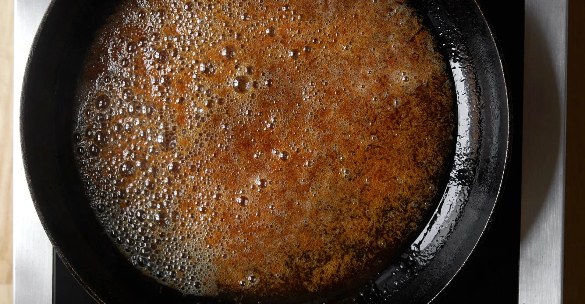 Når sukkeret er blevet gyldent, så tilsæt smørret, og lad det bruse op.