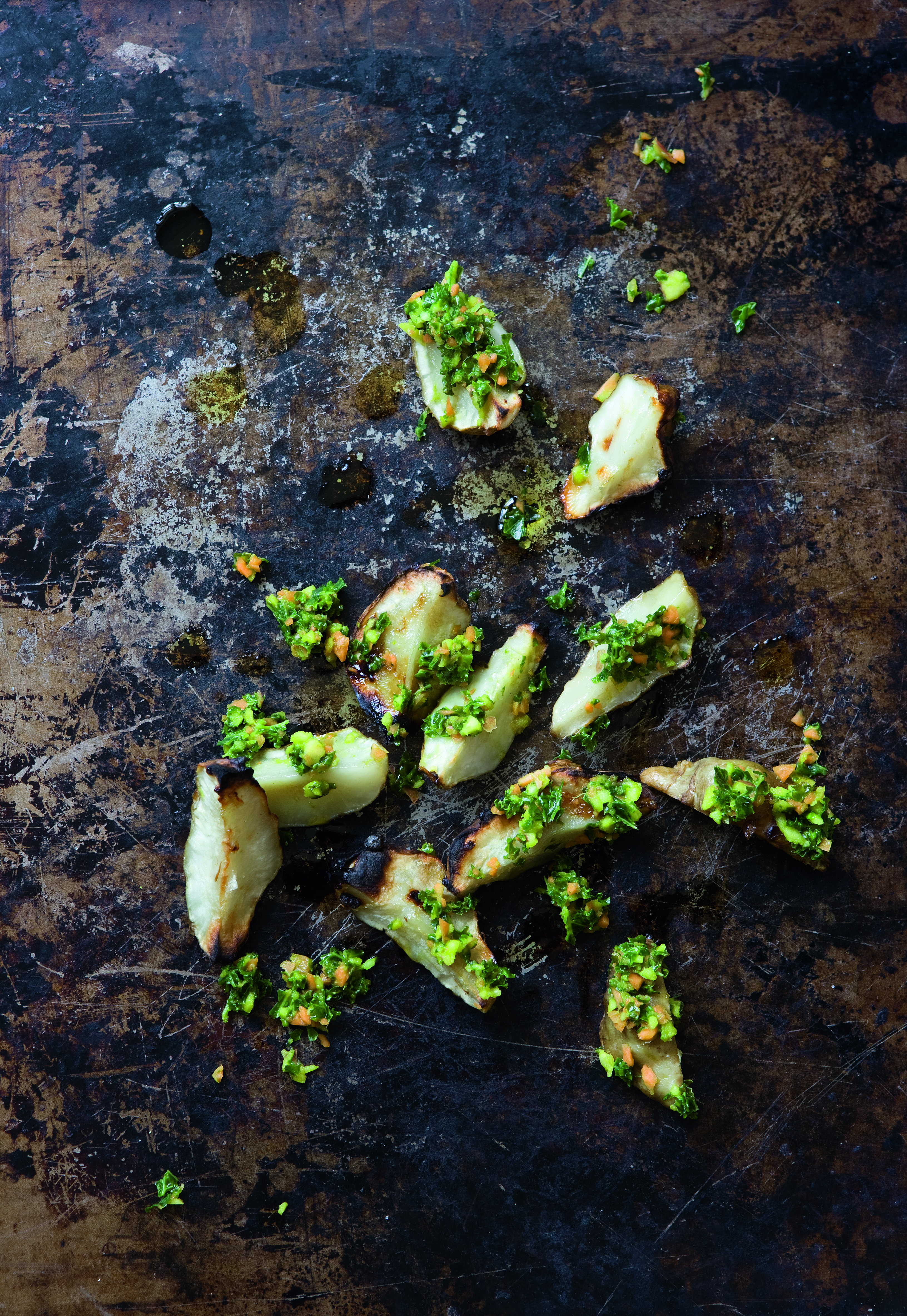 Halver jordskokkerne og steg dem gyldne på snitfladen. Drys med flagesalt og frisk timian ved anretning.