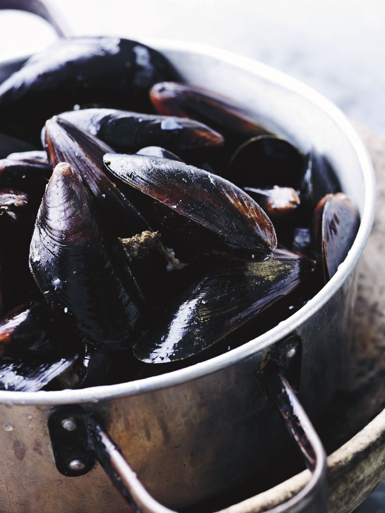 Rens muslingerne i koldt vand, og tjek for liv: Er muslingerne åbne, så bankes de let mod bordpladen. Hvis de lukker sig, er de levende, men forbliver de åbne, er de døde og skal så kasseres. Kasser også muslinger, hvor skallen er slået i stykker. Pil løg og hvidløg, og rens porren.