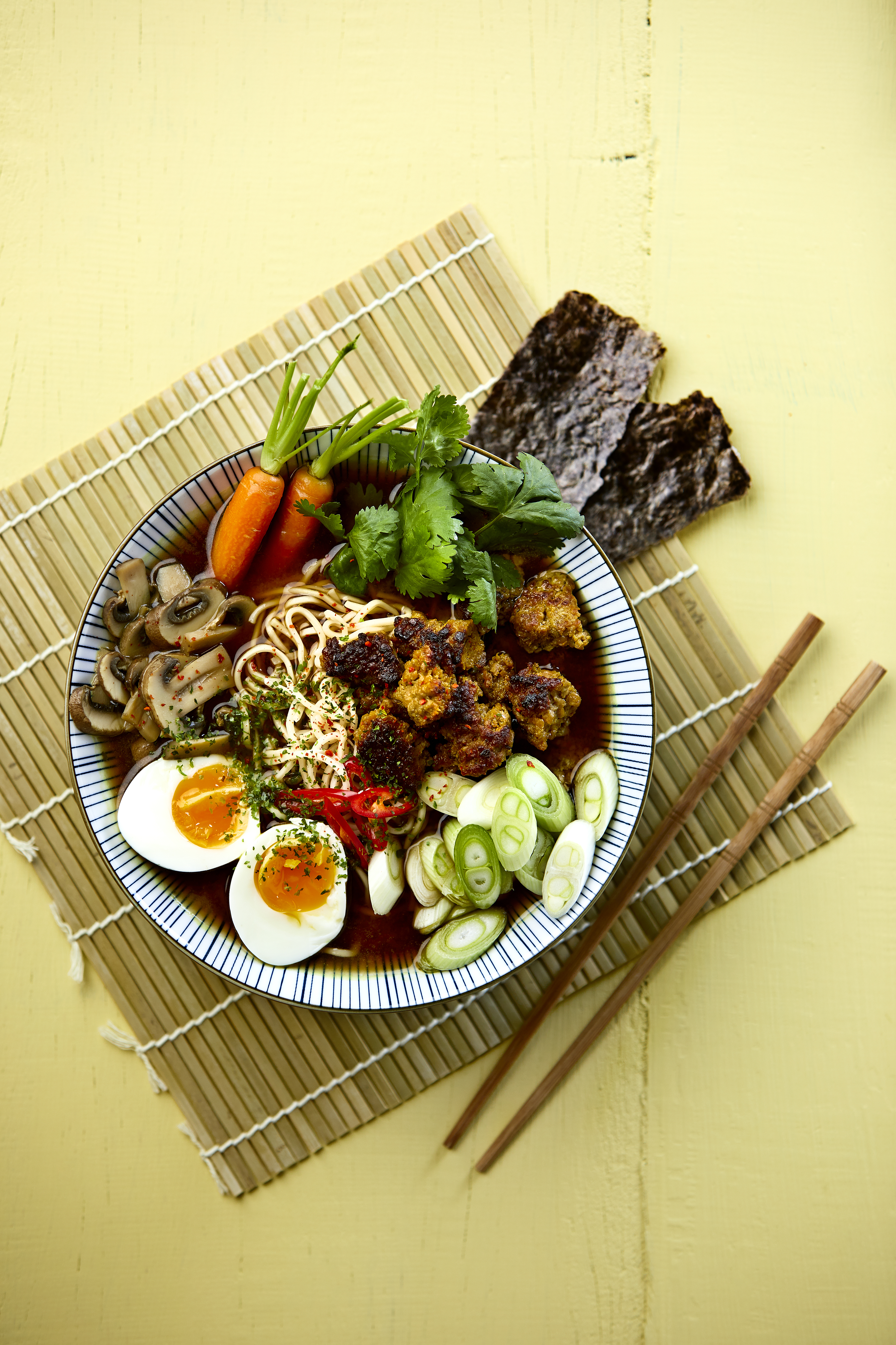 Kom instant eller forkogte nudler i to forvarmede skåle.