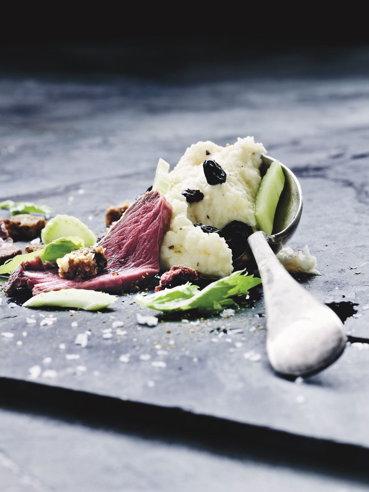 Fjern de største sener fra andebrysterne, og rids skindet. Læg andebrysterne med skindsiden nedad i en kold pande, og sæt panden over blusset på mellem varme. Langsomt vil fedtet smelte fra, og skindet bliver sprødt. Når kødet er sprødt, vendes brysterne, og steges gyldne på kødsiden på den varme pande i et par minutter. Brysterne skal stadig være rosa. Krydr skindet med salt, peber og enebær. Kog panden af med kirsebæreddike, til væden næsten er væk. Smelt honningen ud i panden, og glaser kort andebrysterne heri, til kødet er dækket på alle sider med lagen. Lad kødet hvile lunt, indtil du skærer det ud og anretter det med selleripuréen.