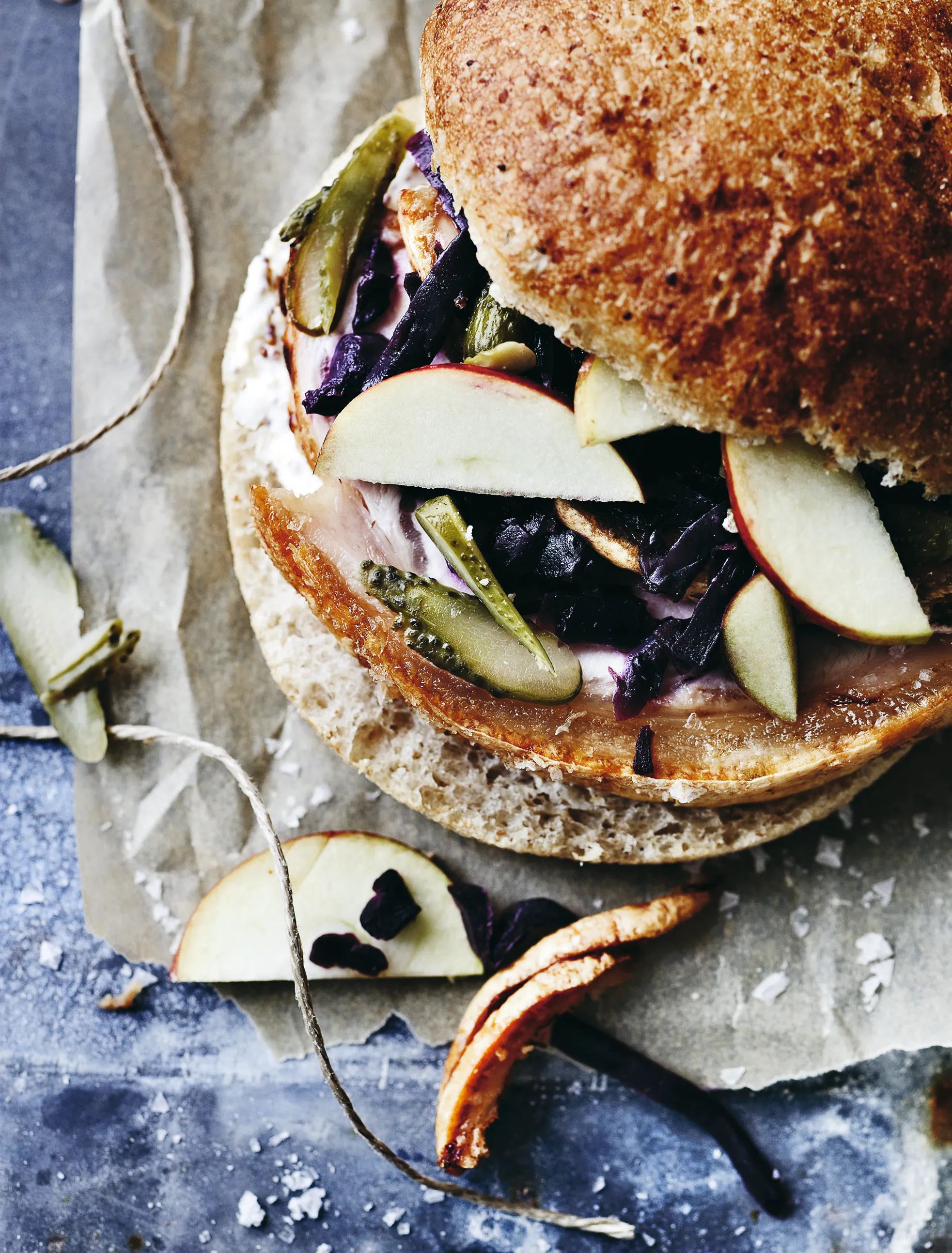 Rør græsk yoghurt, mayonnaise og sennep sammen til en dressing, og smag til med eddike, honning, salt og peber. Skær æblerne i kvarte, befri dem for kernehus, og skær æblerne i tynde skiver. Skær også cornichonerne i skiver. Lun rødkålen op i en lille gryde, og lun evt. også flæskestegen i ovnen ved 170° i 10-15 minutter (gør det, før du skærer den i skiver, så den ikke bliver tør). Flæk sandwichbollerne, og varm dem evt. op i ovnen. Smør derefter sennepsdressingen på både top og bund. Skær flæskestegen i 8 skiver, og læg 2 i hver bolle, drys med lidt salt, og kom derpå tynde skiver af frisk æble, lun rødkål (dryp evt. af i sigte først) og cornichoner i. Luk bollerne sammen, og server dem straks. Hvis de kommer til at stå lidt, kan du risikere, at saften fra rødkålen alligevel arbejder sig ned i brødet, så lad være med at gemme – bid til bollen i stedet!