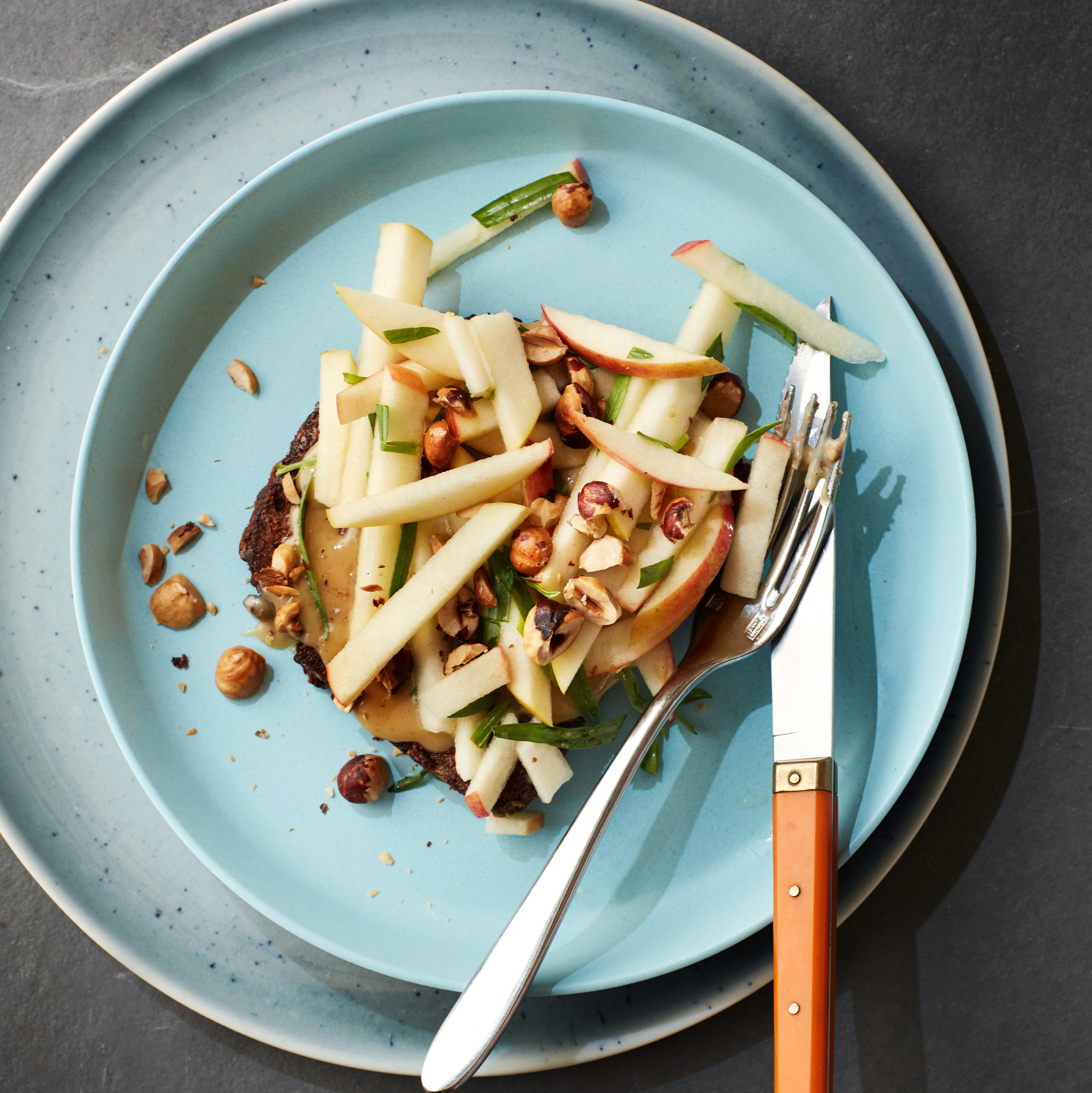 Læg brødet på tallerkener, og top med æble, karamelsauce, evt. en halv håndfuld grofthakkede hasselnødder og citronsaft.