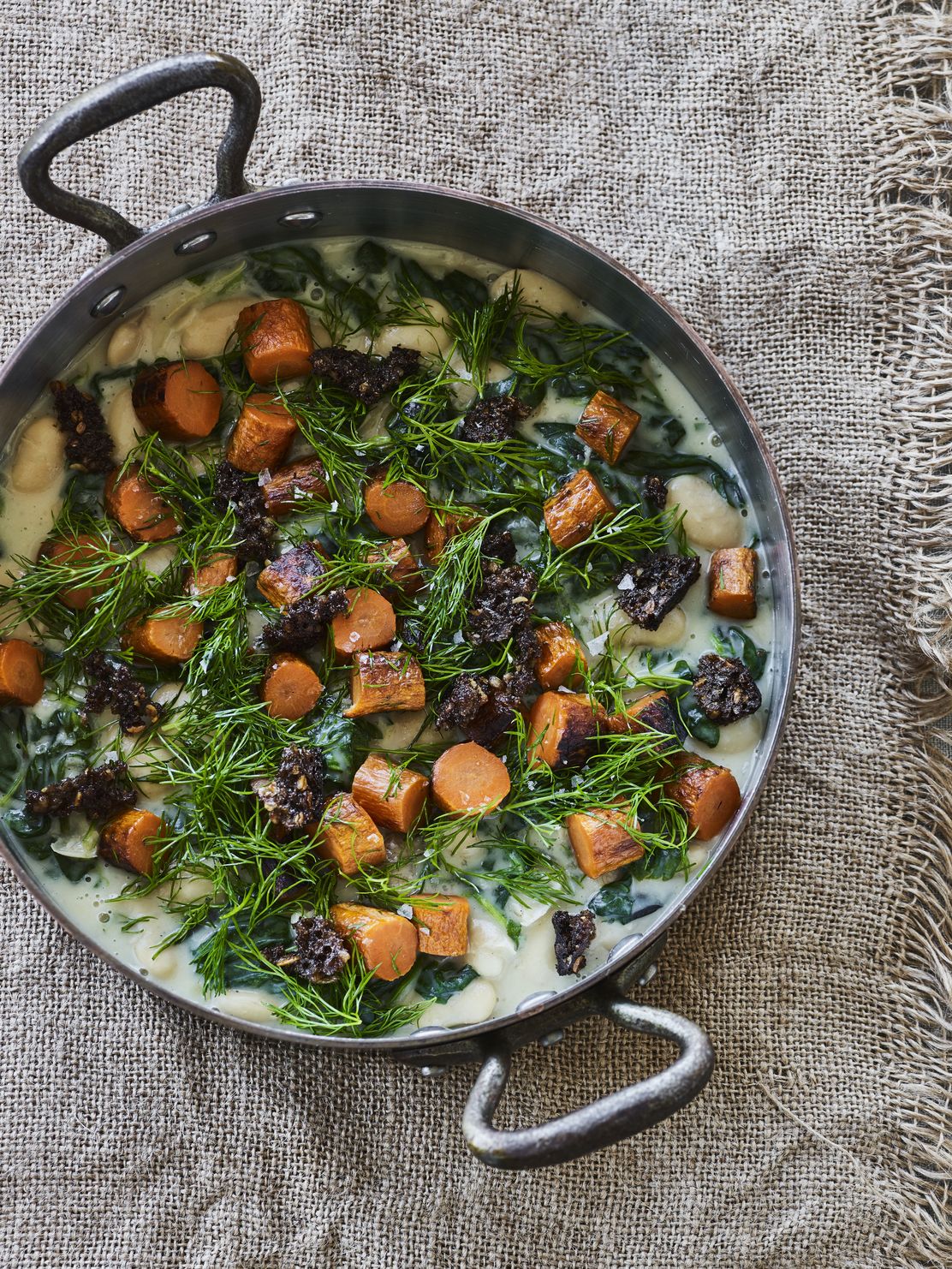 Kom bønner og spinat i saucen sammen med dild og fintrevet citronskal. Varm det godt igennem, til spinaten falder sammen, og smag til med salt og masser af sort peber og lidt citronsaft.