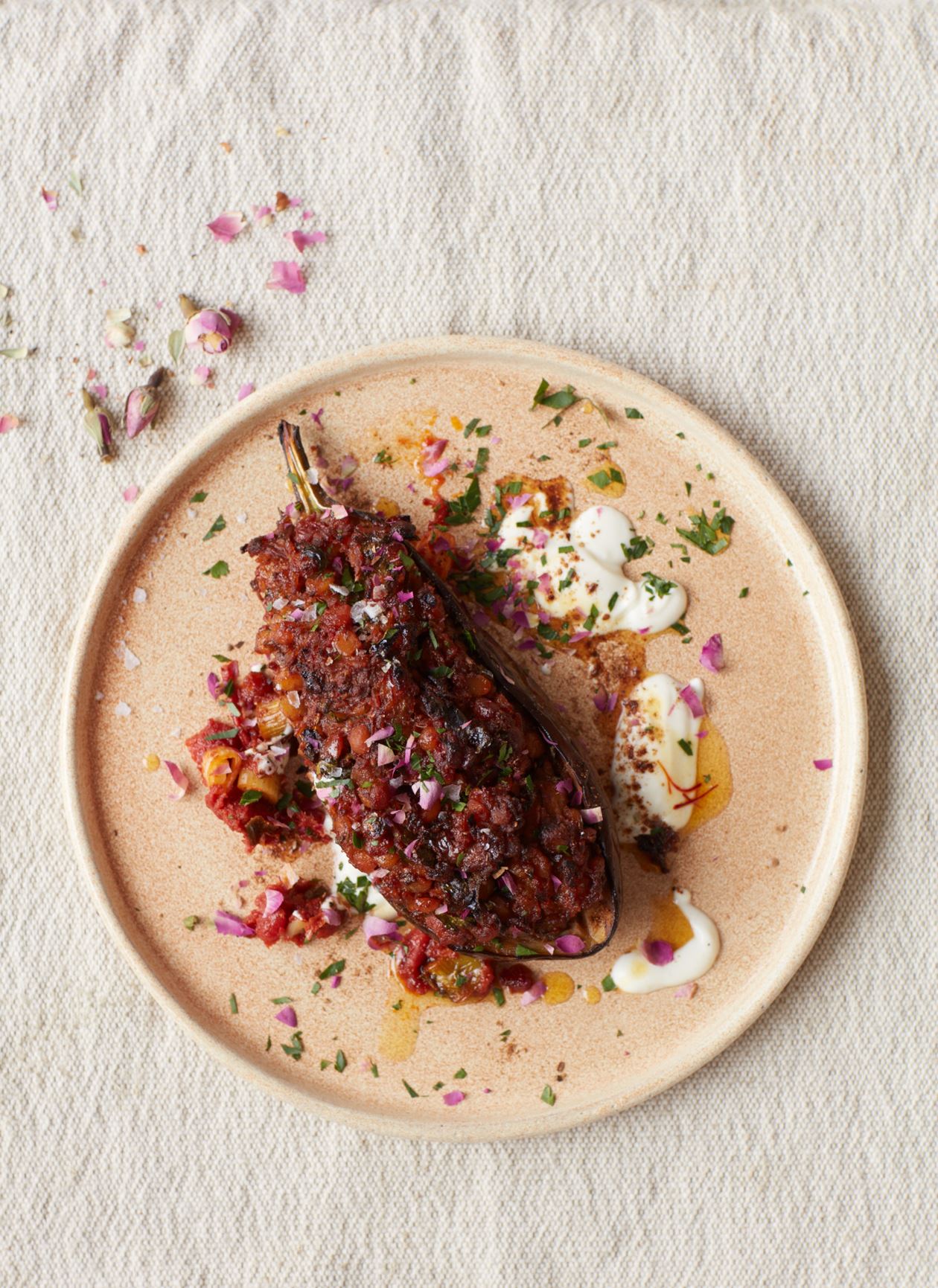 Fordel fyldet i auberginerne, og pres det godt ned, til alt fyldet er brugt. Kom de flåede tomater i et ovnfast fad sammen med skiver af forårsløg og drys med 1 spsk. advieh. Krydr med salt og peber, og læg de fyldte auberginer ovenpå. Pensl de fyldte auberginer med olivenolie, og bag i ovnen ved 180° i ca. 60-70 minutter. Det er vigtigt, at auberginerne er helt møre. De skal ikke give modstand, hvis du prikker i dem med en urtekniv.