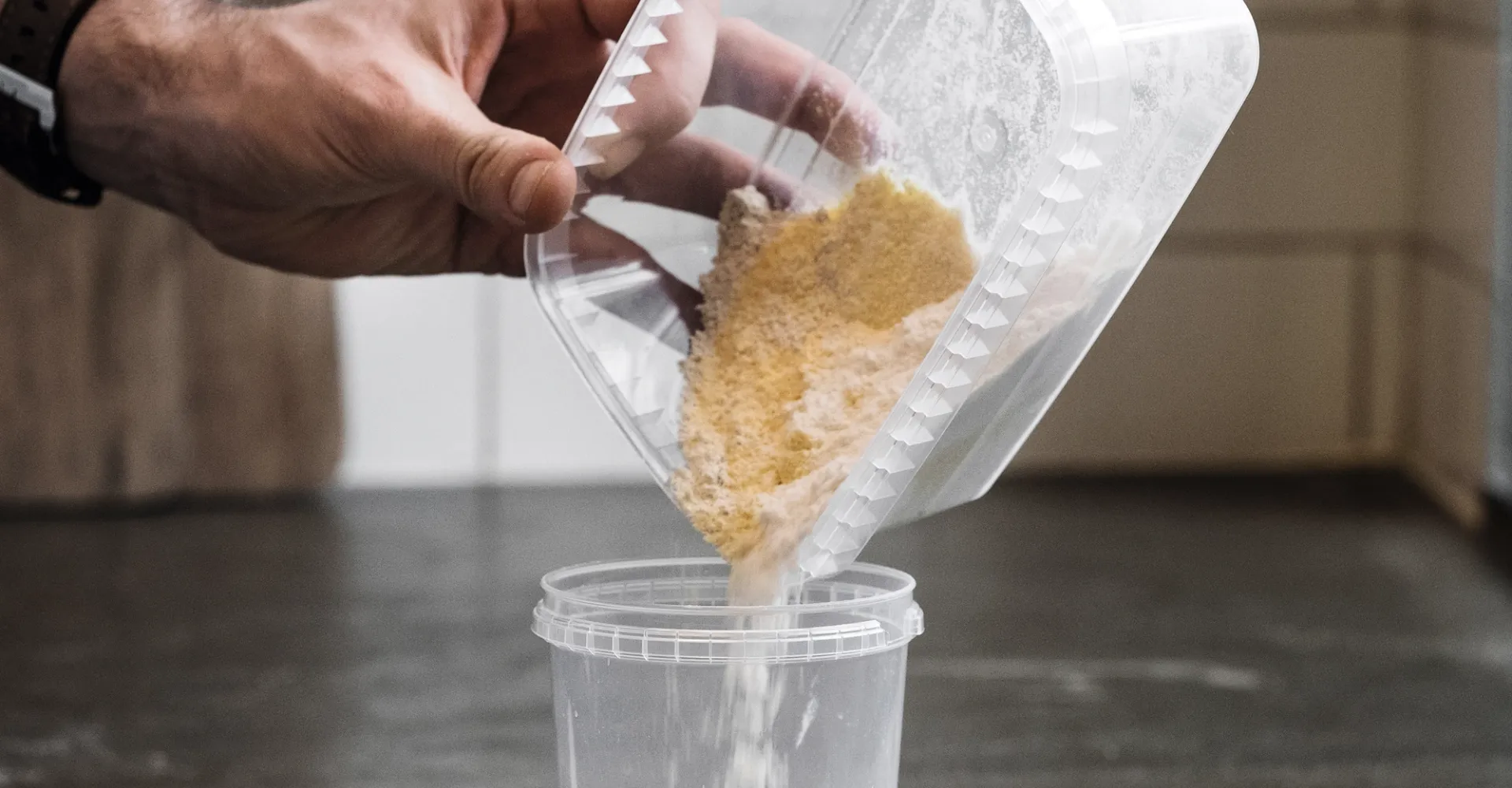 Du skal kun bruge 50 g af surdejen fra køleskabet. Del din surdej op – noget bruger du i din brøddej og resten bliver til din nye køleskabssurdej.
