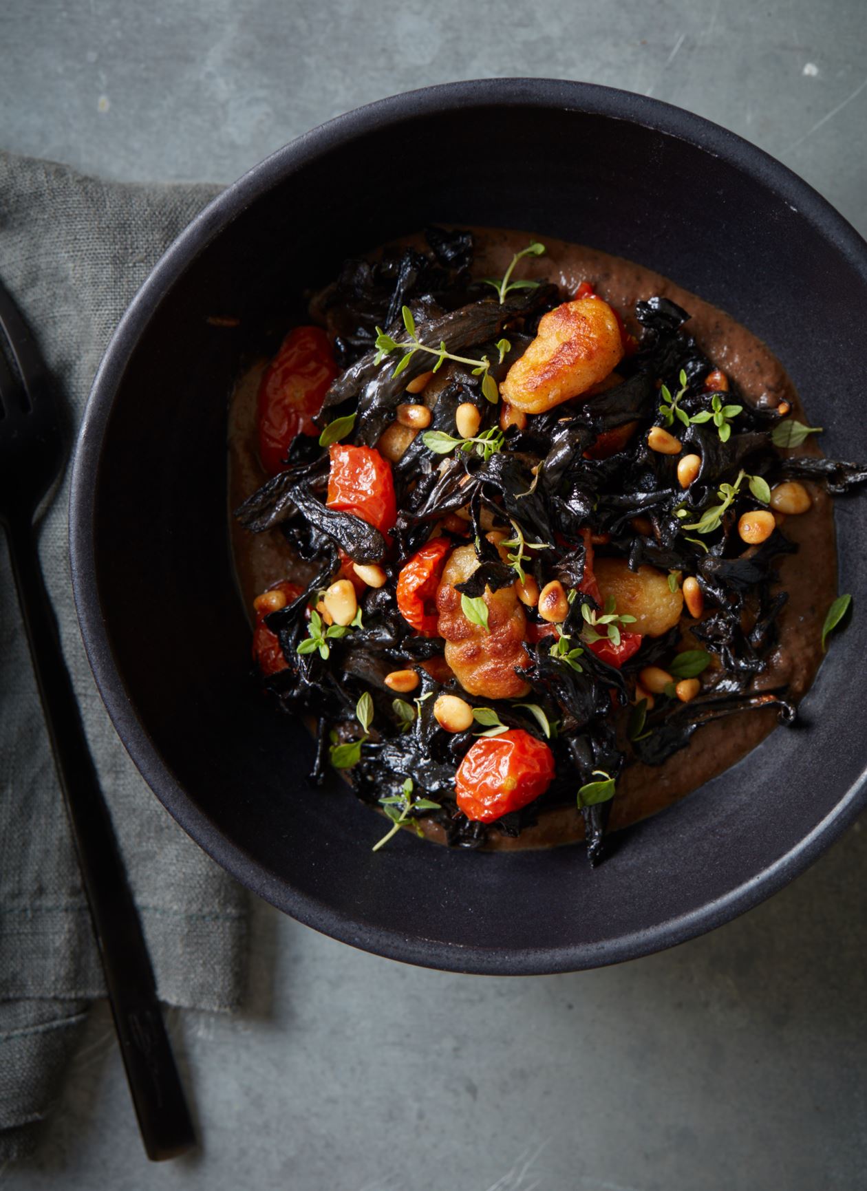 Rist pinjekernerne på en tør pande eller i ovnen, til de er blevet gyldne. Anret en god portion varm bønnesauce i en skål og top med gnocchi og svampe. Fordel en lille håndfuld bagte tomater og ristede pinjekerner ovenpå og slut af med timianblade.
