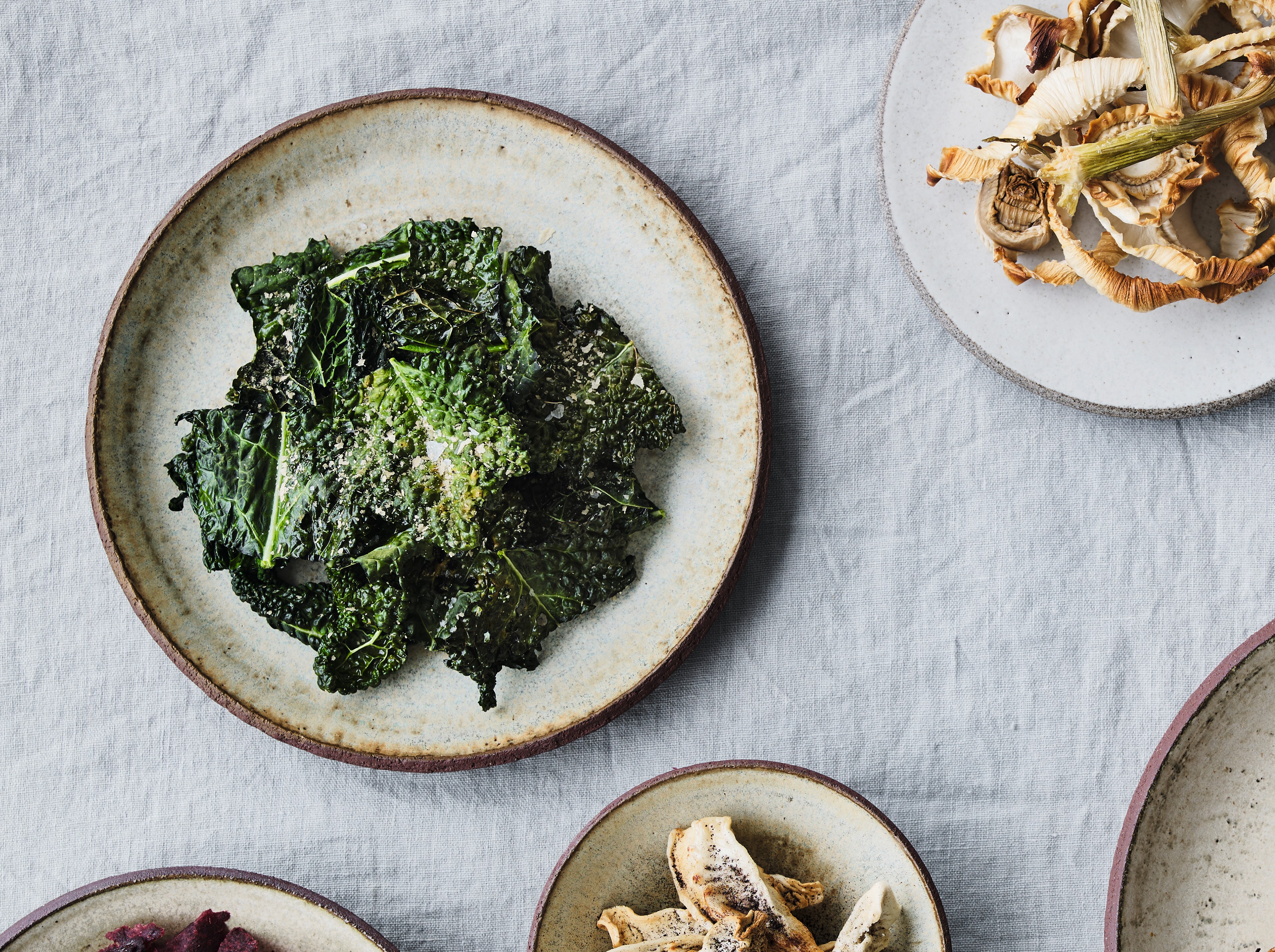 Skyl kålbladene, og slyng dem helt tørre i en salatslynge eller et viskestykke. Vend dem med sesamolie og lidt salt, og bag dem i ovnen ved 160 grader i 15 minutter, til de er sprøde. Drys med flagesalt.