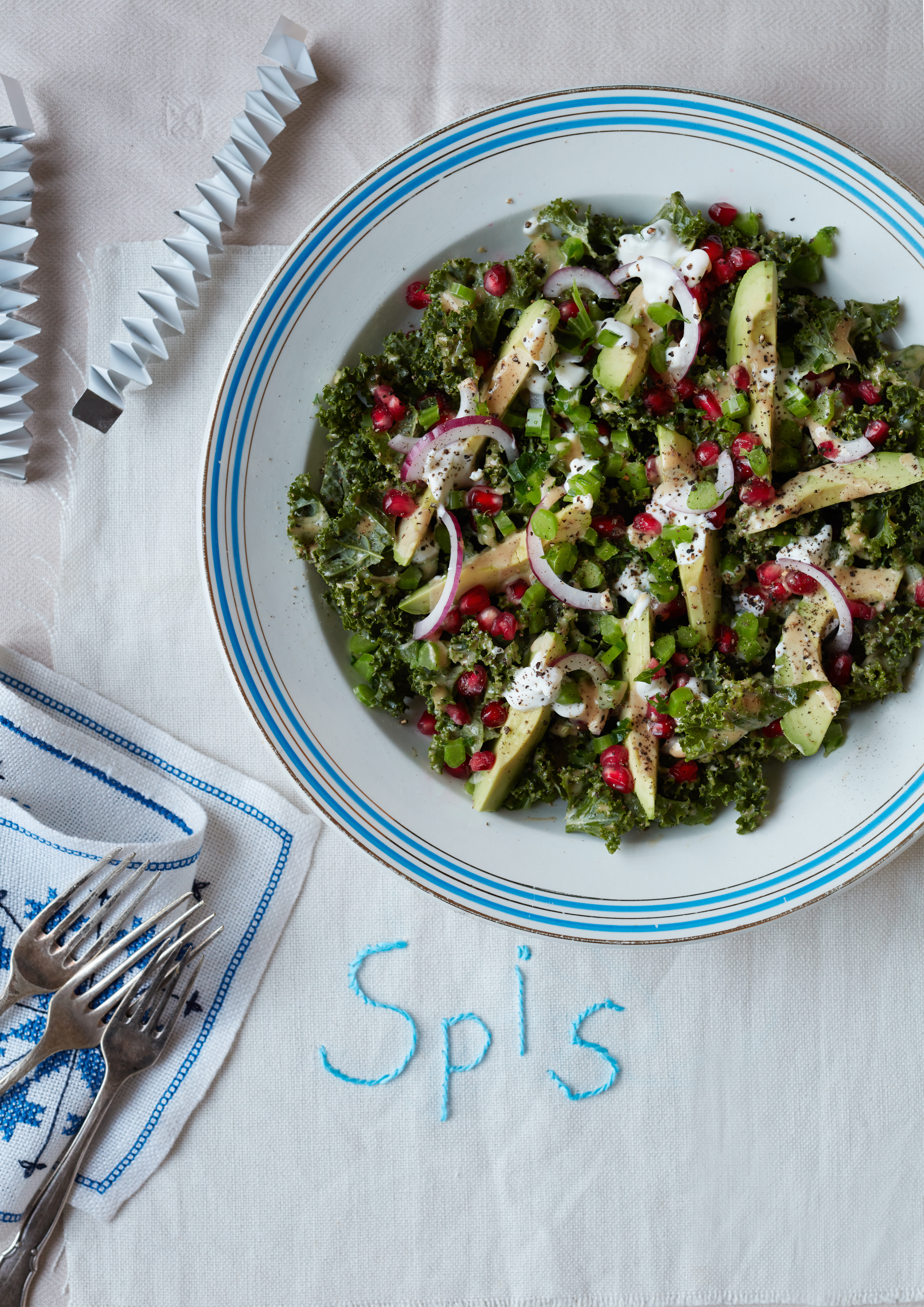 Vend kålen med ca. halvdelen af dressingen, og lad den trække i 10 minutter. Vend derefter kålen med granatæblekerner, avokado og rødløg. Krydr med salt og peber, og justér evt. smagen med lidt mere limesaft.